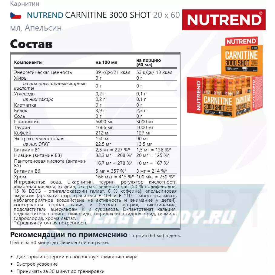 Продукт содержит высокую концентрацию одного из наиболее эффективных пищевых добавок, предназначенных для сжигания жира – 3000 мг L-карнитина в каждой монодозе в комбинации с избранными витаминами группы В.
