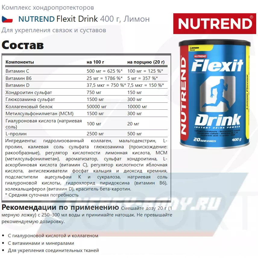 Продукт представляет собой комплексную пищевую добавку, предназначенную для суставов. FLEXIT DRINK содержит глюкозамин сульфат, хондроитин сульфат, белки коллагена и пептиды, аминокислоты, метилсульфонилметан, гиалуроновую кислоту, вещества, препятствующие возникновению остеопороза: кальций, магний, витамины. FLEXIT DRINK предназначен для повышения питательных свойств и обогащения пищи в случае проблем с суставами, для людей, чьи суставы испытывают повышенную нагрузку и подвергаются риску изнашивания (во время занятий спортом, при избыточном весе тела), для людей с ограниченной подвижностью или повышенной утомляемостью суставов, для женщин с целью предупреждения возникновения остеопороза, для лиц, потребляющих недостаточное количество кальция.