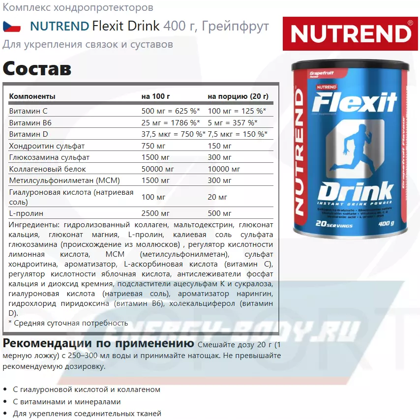 Продукт представляет собой комплексную пищевую добавку, предназначенную для суставов. FLEXIT DRINK содержит глюкозамин сульфат, хондроитин сульфат, белки коллагена и пептиды, аминокислоты, метилсульфонилметан, гиалуроновую кислоту, вещества, препятствующие возникновению остеопороза: кальций, магний, витамины. FLEXIT DRINK предназначен для повышения питательных свойств и обогащения пищи в случае проблем с суставами, для людей, чьи суставы испытывают повышенную нагрузку и подвергаются риску изнашивания (во время занятий спортом, при избыточном весе тела), для людей с ограниченной подвижностью или повышенной утомляемостью суставов, для женщин с целью предупреждения возникновения остеопороза, для лиц, потребляющих недостаточное количество кальция.