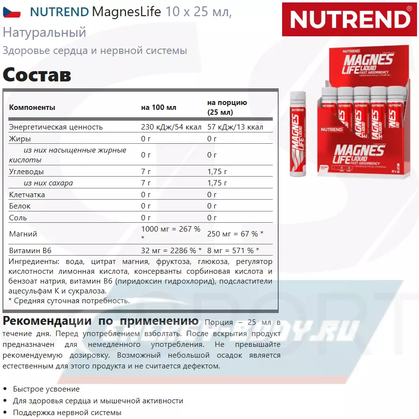 Первоклассная и быстро усваиваемая жидкая форма магния, обогащенная витамином B6. Спортсмены используют этот продукт, чтобы помочь в случаях острого дефицита. К таким случаям можно отнести судороги, недомогание, головные боли и тому подобное. Из-за высокой физической активности, неправильного питания или влияния стресса уровень магния в организме снижается. Высокоэффективный раствор ионов магния (магния), содержащий 250 мг этого важного минерала, помогает быстро пополнить запасы. Магний выполняет множество жизненно важных функций в организме. Магний вместе с витамином B6 способствует снижению усталости и утомляемости, а также поддерживает электролитный баланс. Он поддерживает нормальное функционирование энергетического обмена и способствует нормальному функционированию нервной системы. Магний способствует нормальному синтезу белка и мышечной активности. Жидкая форма обеспечивает более быстрое восстановление этого минерала, а благодаря практичной упаковке вы всегда можете иметь его с собой.