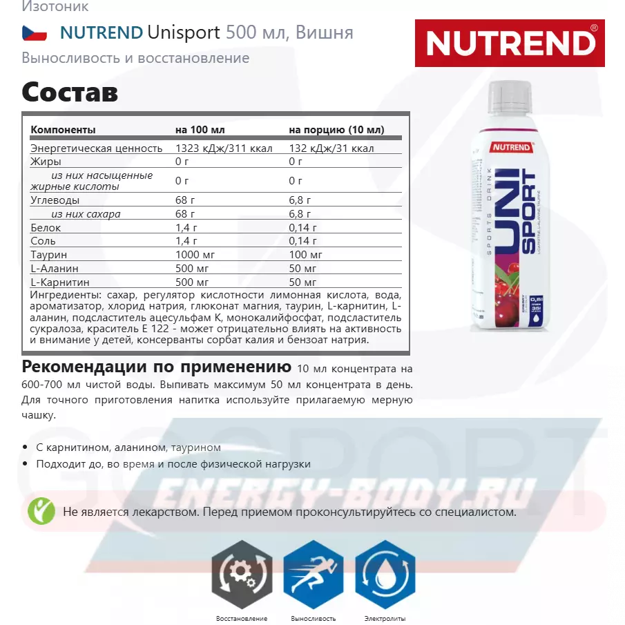 - Пригоден для использования спортсменами, содержит сахар и подсластители.