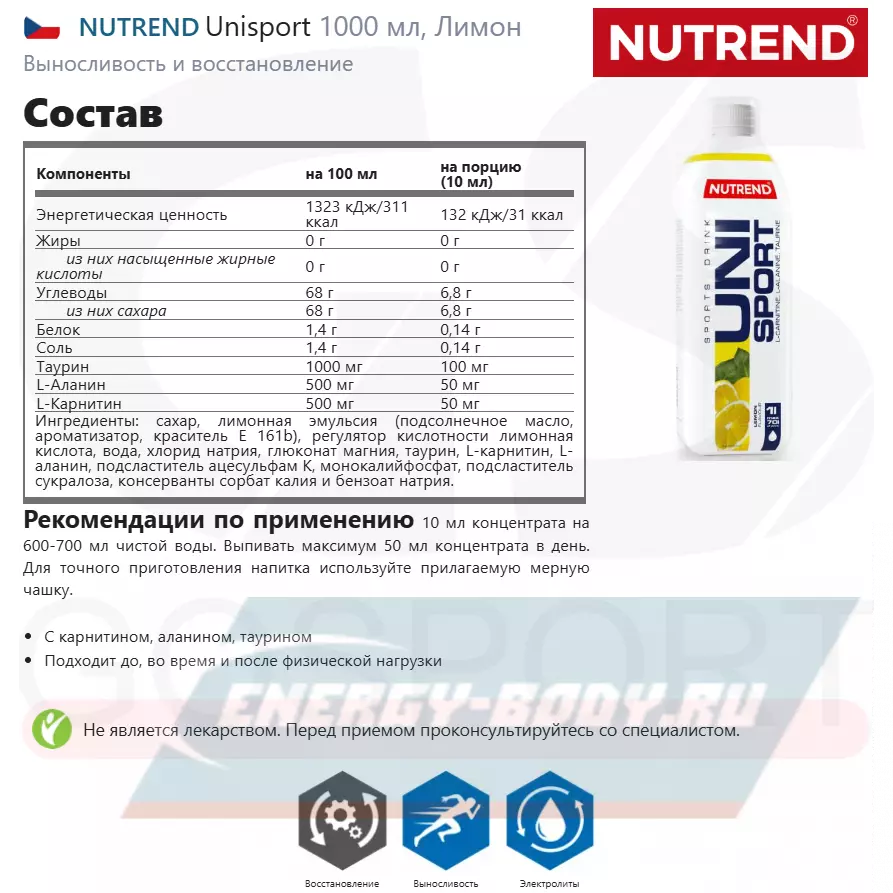 Концентрат минерализованного напитка, обогащённый высокоэффективными аминокислотами таурином, глицином и L-карнитином, предназначенный для приготовления средне энергетического гипотонического напитка, разработан для восполнения запасов потерянной организмом жидкости, стимулирования восстановления и природного насыщения организма энергией. Во время соблюдения питьевого режима спортсменами и лицами, испытывающими значительные физические нагрузки продукт допускает практически неограниченное его потребление как до и во время физической нагрузки, так и в период восстановления.
