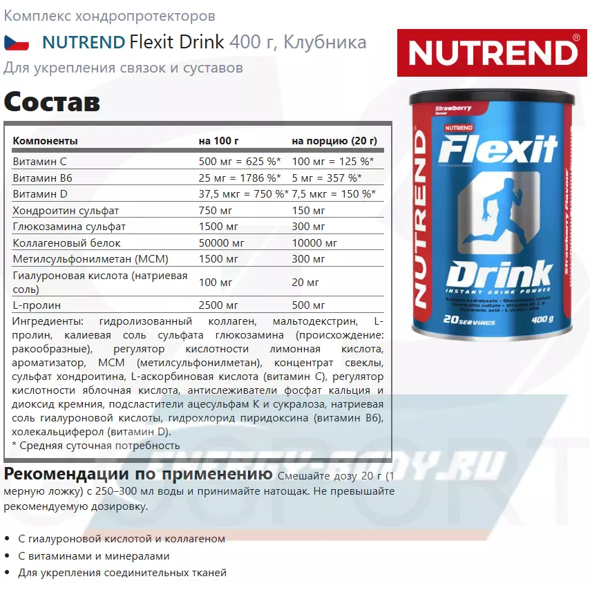Продукт представляет собой комплексную пищевую добавку, предназначенную для суставов. FLEXIT DRINK содержит глюкозамин сульфат, хондроитин сульфат, белки коллагена и пептиды, аминокислоты, метилсульфонилметан, гиалуроновую кислоту, вещества, препятствующие возникновению остеопороза: кальций, магний, витамины. FLEXIT DRINK предназначен для повышения питательных свойств и обогащения пищи в случае проблем с суставами, для людей, чьи суставы испытывают повышенную нагрузку и подвергаются риску изнашивания (во время занятий спортом, при избыточном весе тела), для людей с ограниченной подвижностью или повышенной утомляемостью суставов, для женщин с целью предупреждения возникновения остеопороза, для лиц, потребляющих недостаточное количество кальция.