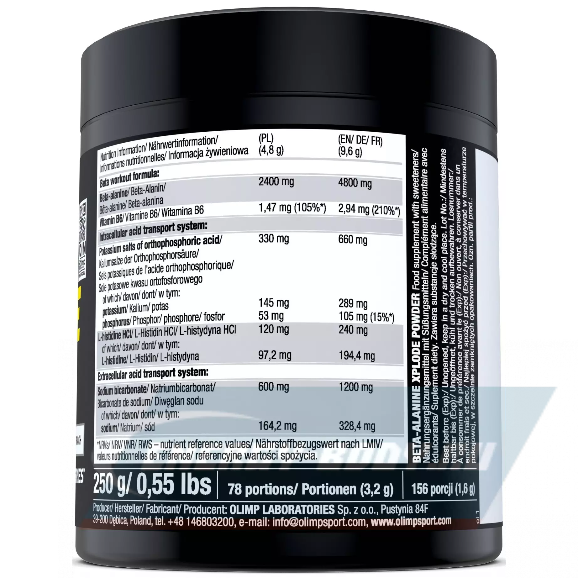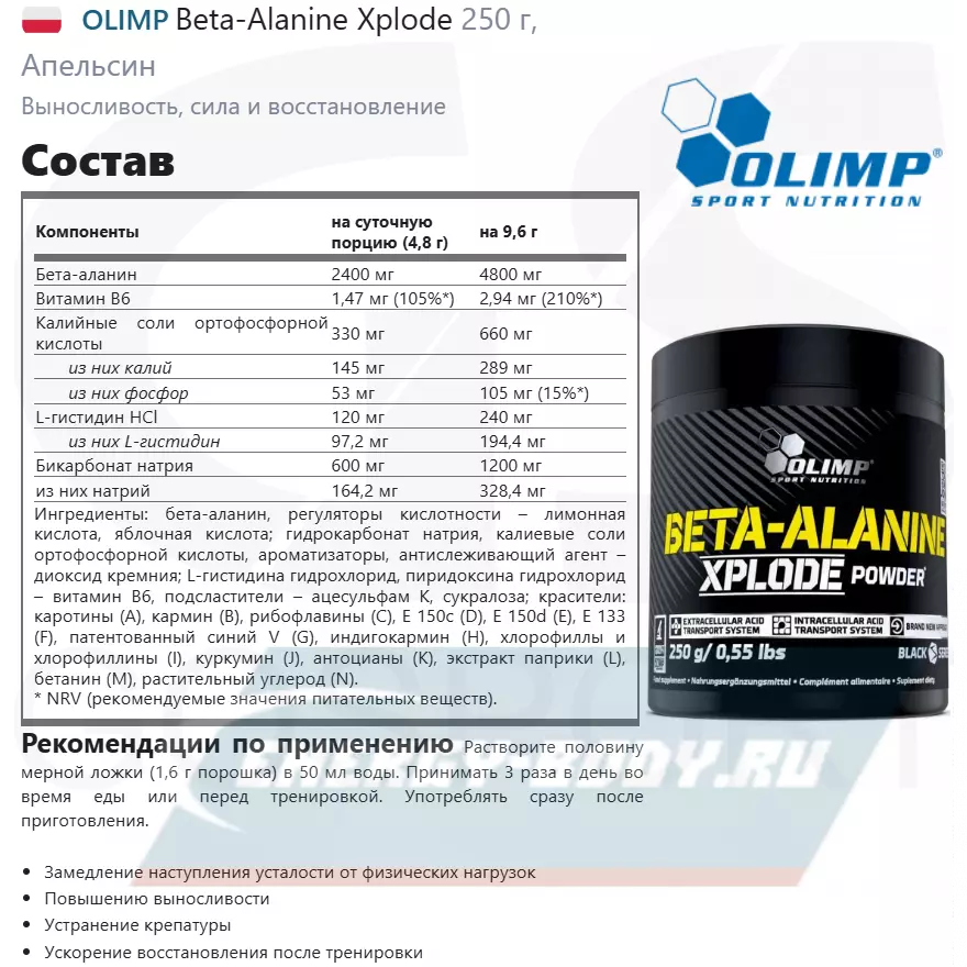 Ингредиенты BETA-ALANINE Xplode Powder® были выбраны для совместной работы с целью увеличения объема тренировки, как в отношении продолжительности усилий и используемых весов, так и при минимальном отдыхе между сеансами.