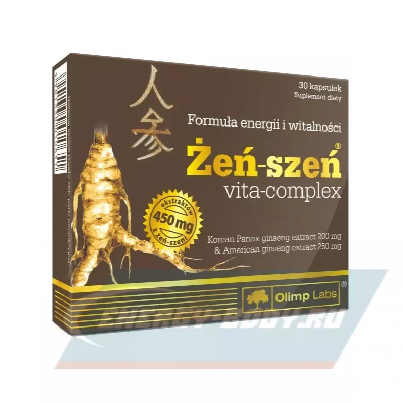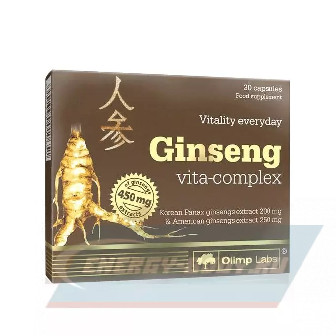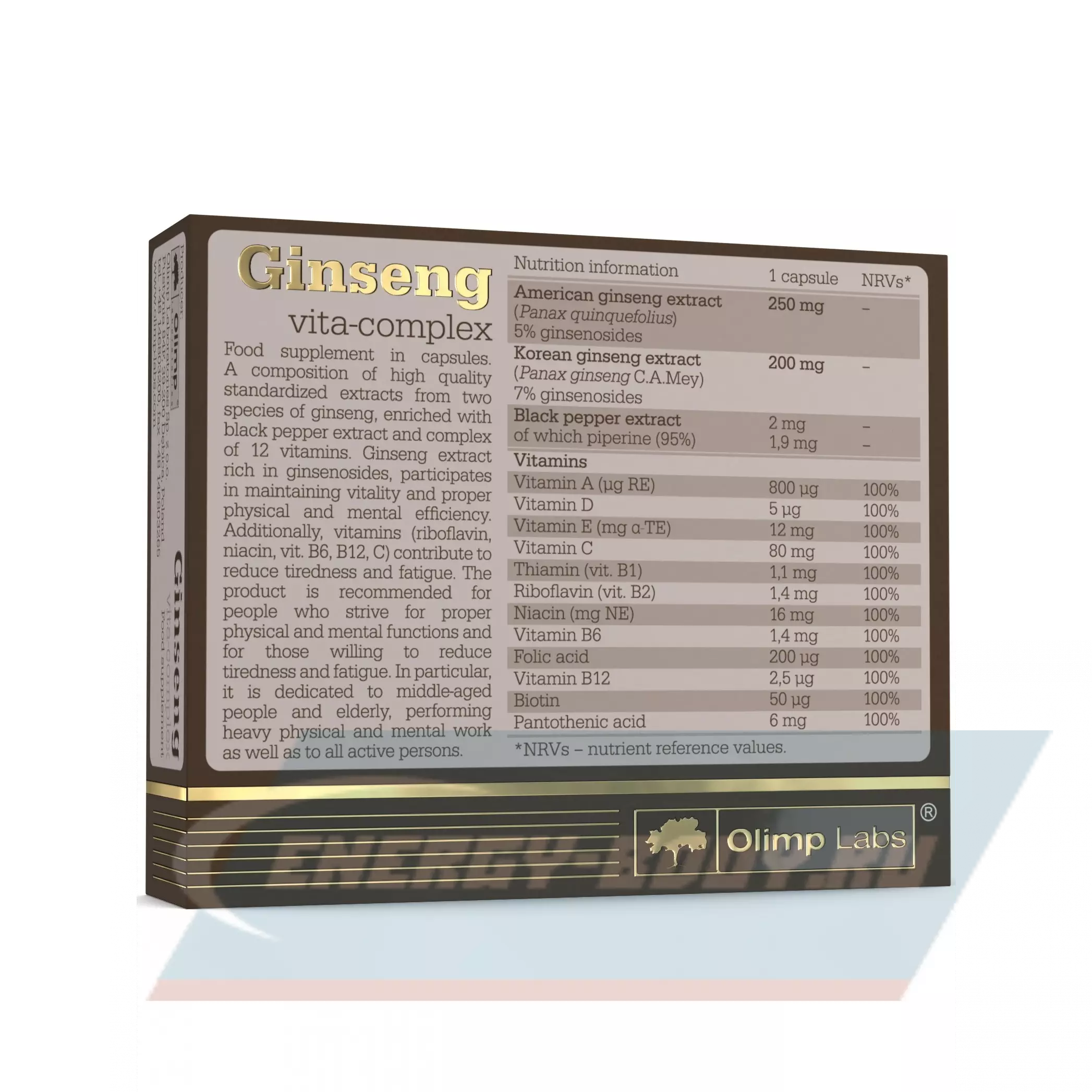 Экстракт корня американского женьшеня (Panax quinquefolius), экстракт корня корейского женьшеня (Korean Panax Ginseng), витамины (L-аскорбиновая кислота, DL-?-токоферола ацетат, никотинамид, D-биотин, ретинола ацетат, D- кальция пантотенат, пиридоксина гидрохлорид, холекальциферол, фолиевая кислота, тиамина мононитрат, рибофлавин, цианокобаламин), экстракт черного перца, Е460i, Е570, капсула (желатин, краситель: E 171).Состав OLIMP Ginseng vita-complex