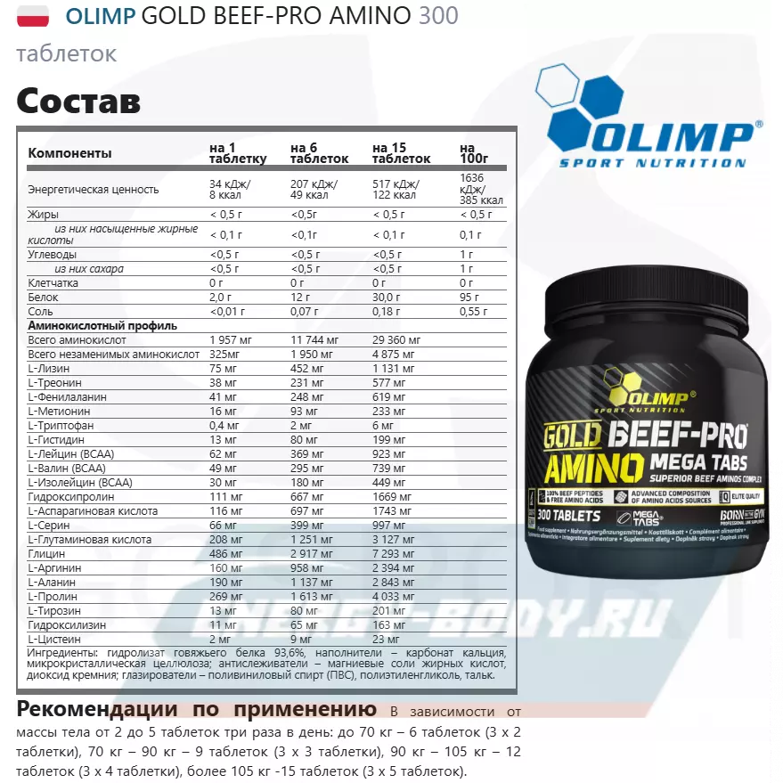 Питание физически активных людей заставляет производителей диетических добавок сталкиваться с постоянно растущими требованиями в отношении разработки группы неаллергических добавок, которые прекрасно переносятся самой широкой группой потребителей, особенно теми, кто физически активен, чья доля в обществе постоянно растет , GOLD BEEF-PRO ™ AMINO был разработан как ответ специалистов авторитетного Olimp Labs®, занимающихся добавками физически активных людей, на необходимость разнообразить источники белков, доступных в рационе физически активных людей, которым необходимо было обогащать свой рацион. с концентрированным бычьим белком высшего качества, с аминокислотным профилем, значимым для физических упражнений.