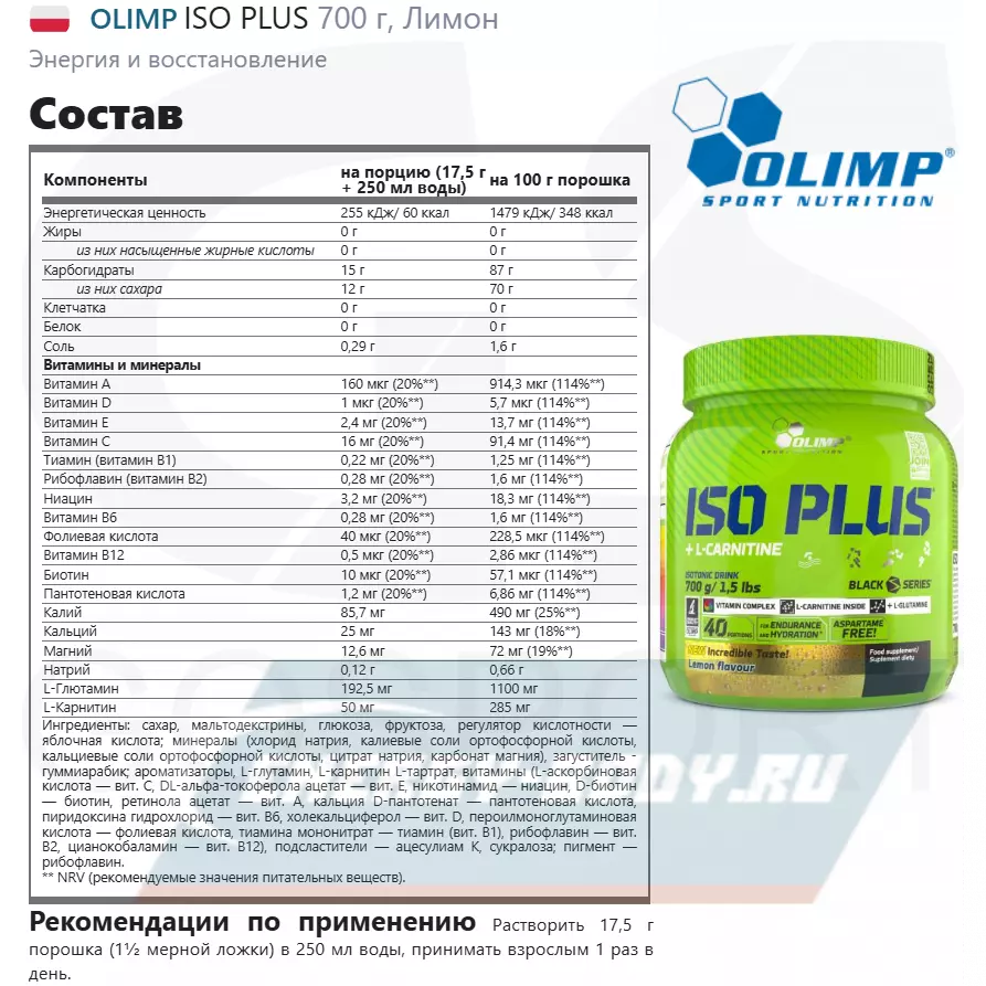 Рекомендуемое применение: растворить 17,5 г порошка (1,5 мерных ложки) в 250 мл воды. Используйте по мере необходимости, особенно во время соревнований, интенсивной тренировки и тяжелого физического труда. Не подходит для диабетиков. Храните в недоступном для детей месте. Рекомендуется разнообразное и сбалансированное питание и здоровый образ жизни.