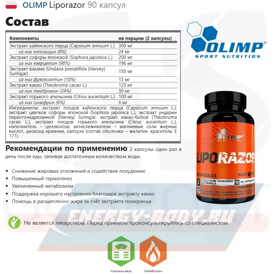 В этой добавке от компании Olimp вы найдете ингредиенты, усиливающие термогенез (экстракт кайенского перца), вещества, которые помогают расщеплять жир (экстракт померанца) и поддерживают хорошее настроение (экстракт какао). Формула LipoRazor не содержит кофеина, часто используемого в других продуктах в очень больших дозах. Это означает, что люди с повышенной чувствительностью к кофеину могут использовать эту добавку для сжигания жира. С такими ингредиентами любой план диеты и тренировок получает реальную поддержку в процессе приближения к телу вашей мечты.