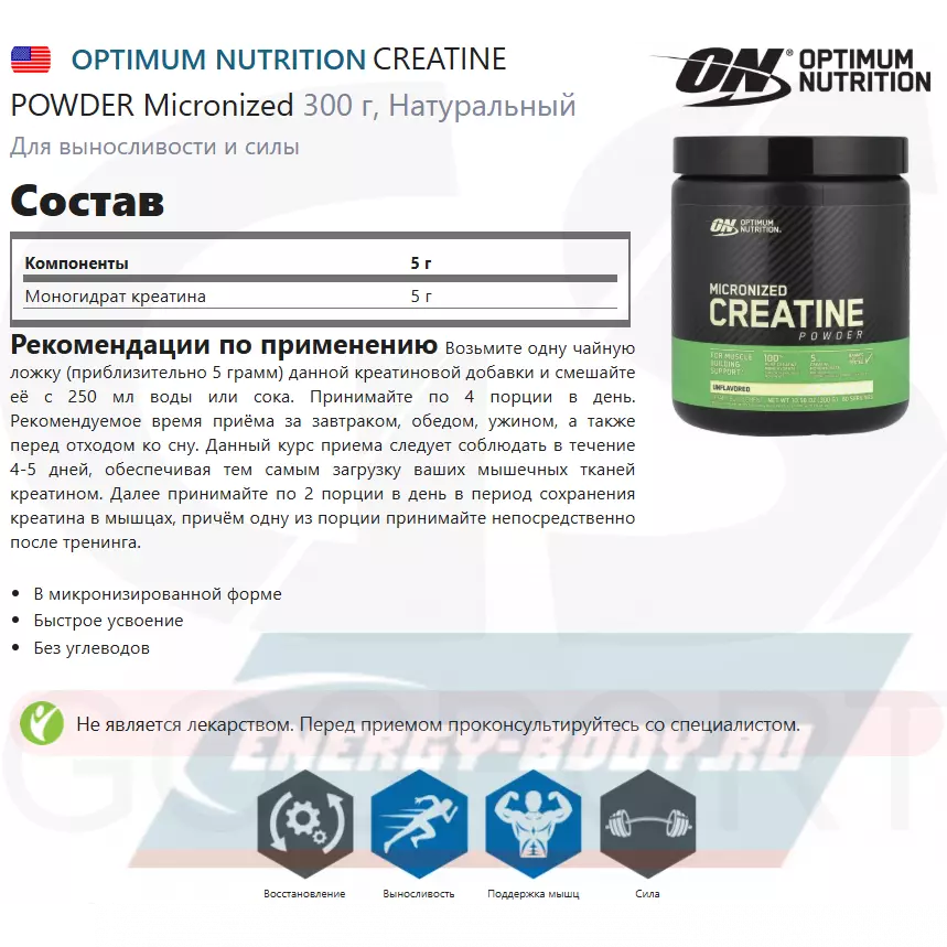 Во-вторых, компания Optimum Nutrition для создания Micronized Creatine Powder использует запатентованный креатин CreaPure, что подчёркивает чистоту и качество представленного продукта.