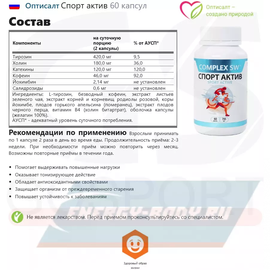 Показания к применению: людям, которые хотят или уже ведут активный образ жизни, занимаются спортом, либо их работа предполагает физические нагрузки. А также людям, чувствующим переутомление или недостаток энергии.