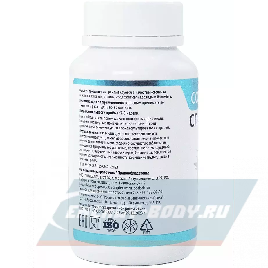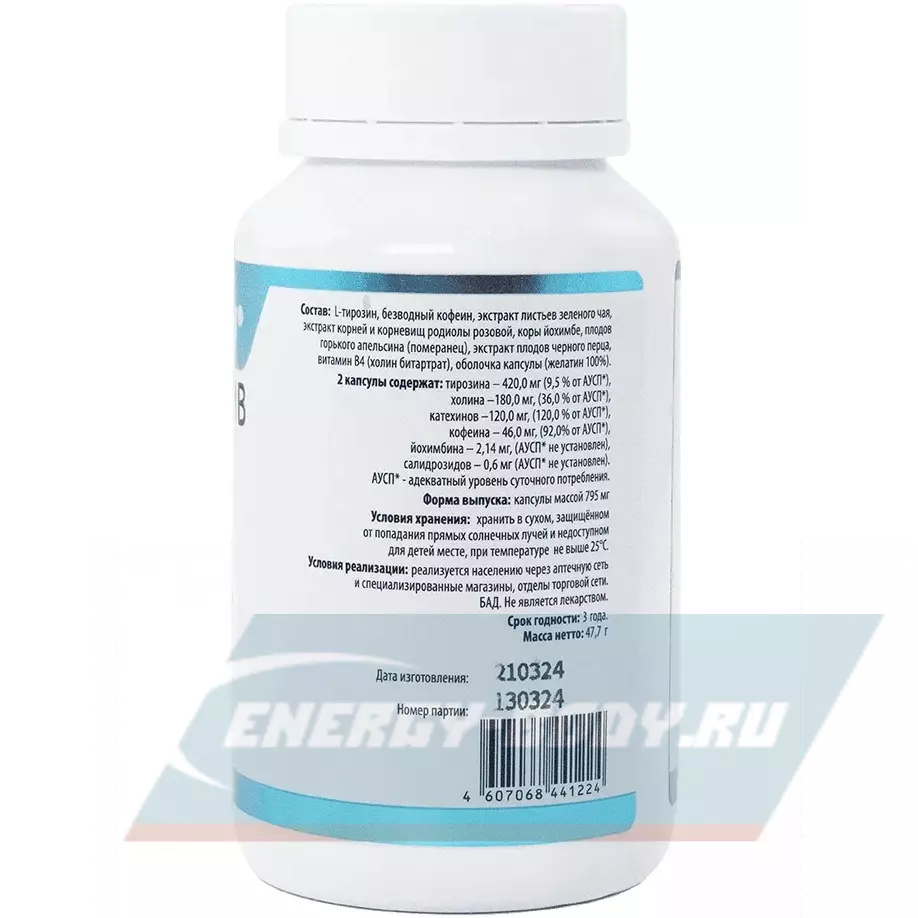 Ингредиенты: L-тирозин, безводный кофеин, экстракт листьев зеленого чая, экстракт корней и корневищ родиолы розовой, коры йохимбе, плодов горького апельсина (померанец), экстракт плодов черного перца, витамин B4 (холин битартрат), оболочка капсулы (желатин 100%).