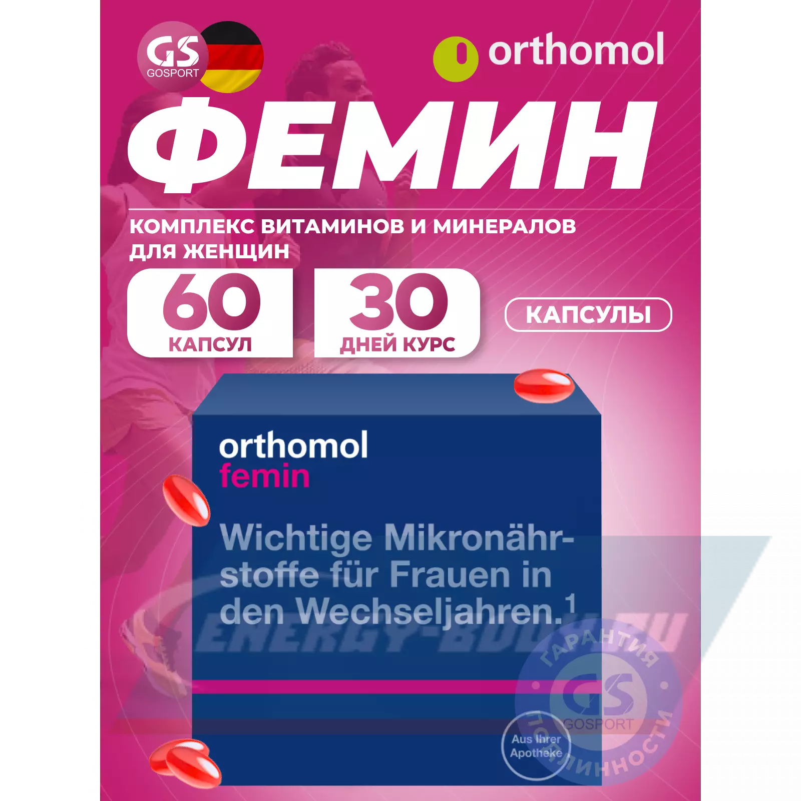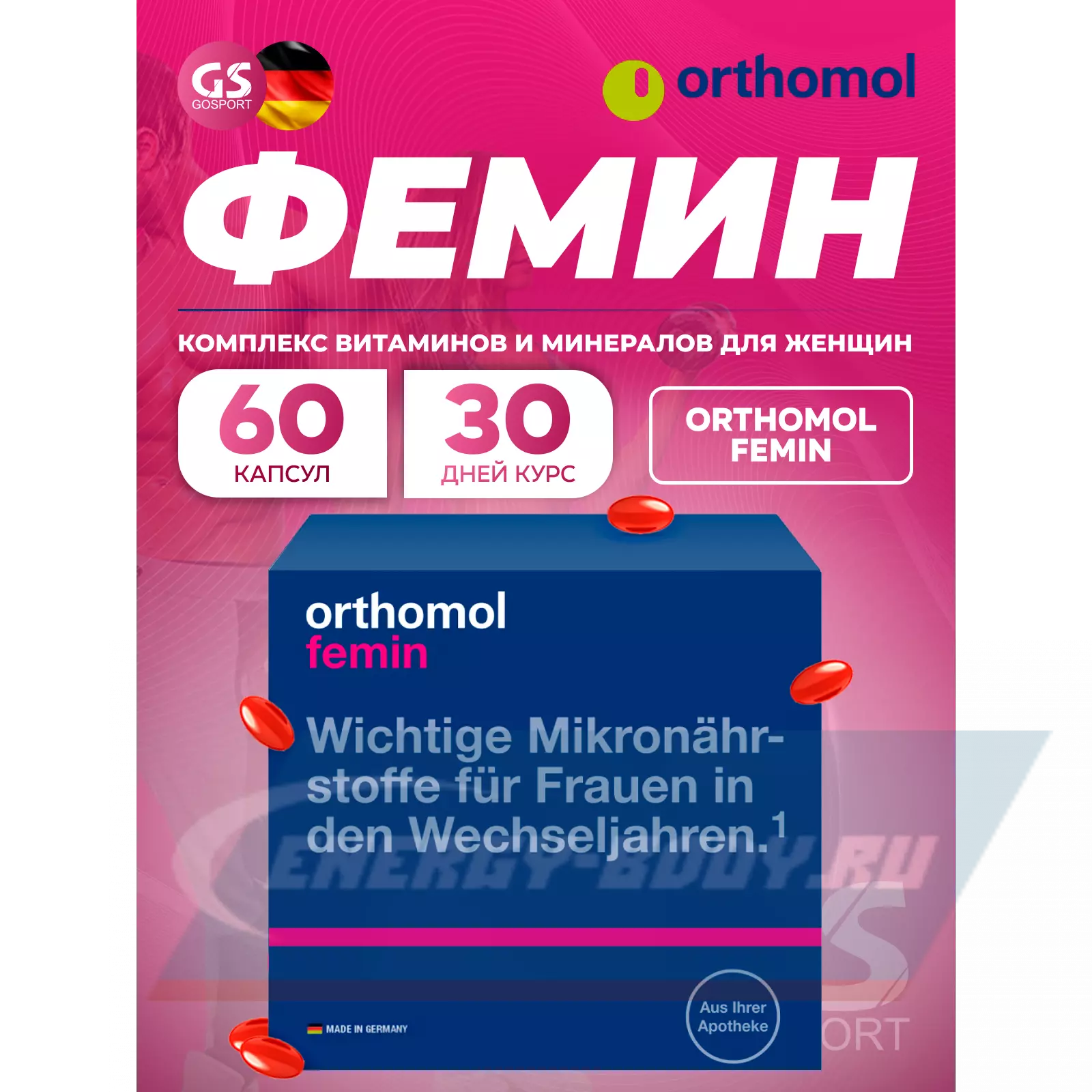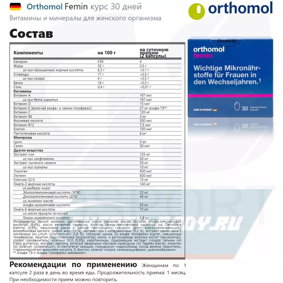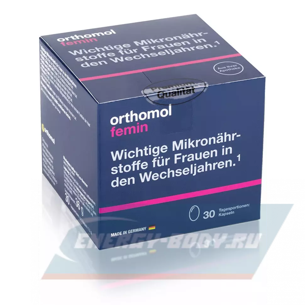 Ортомол Фемин это – специальный комплекс витаминов, микроэлементов и питательных веществ для женщин, переживающих период менопаузы. Ортомол Фемин содержит необходимые питательные вещества для кожи, волос и ногтей. А так же - биофлавоноиды сои, лигнаны льняного семени, незаменимые жирные кислоты и коэнзим Q10 – вещества активно борющиеся с проявлениями менопаузы.