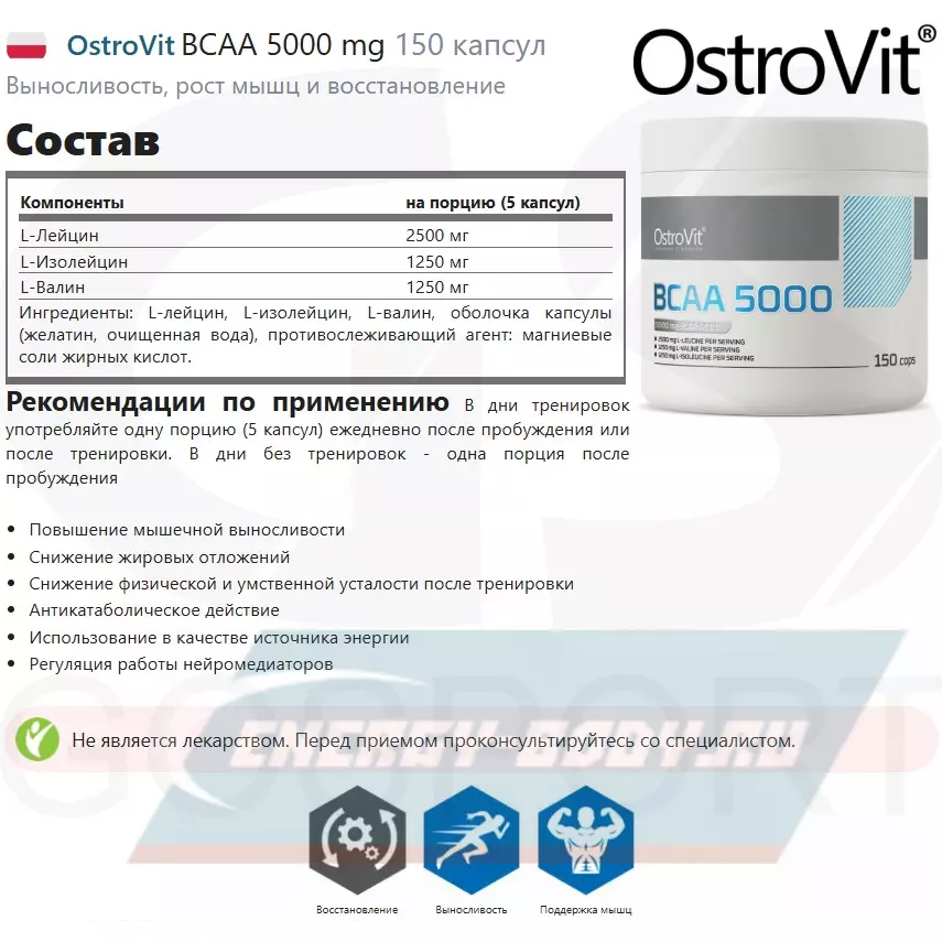 OstroVit BCAA 5000 мг - концентрированный источник аминокислот с разветвленной цепью