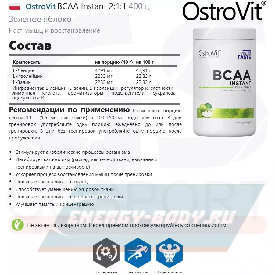 OstroVit BCAA Max Instant - это продукт для тех, кто систематически подвергает себя физическим нагрузкам, как силовым, так и нагрузкам на выносливость и хочет интенсифицировать как сами тренировки, так и получаемый от них эффект. Добавка рекомендуется как для профессионалов, так и для любителей.