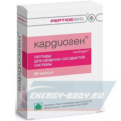 В основе препарата Кардиоген - тетрапептид АКС-К (L-аланин, L-глутаминовая кислота, L-аспарагиновая кислота, L-аргинин). Кардиоген эффективен при повышенных нагрузках на сердце, оказывает седативный эффект при стрессах, справляется с одышкой вызванной расстройствами сердечно-сосудистой системы, способен регулировать артериальное давление, частоту сердечных сокращений, восстанавливает функции клеток сердца и кровеносных сосудов, нормализует клеточный метаболизм, омолаживает ткани сердечно-сосудистой системы.