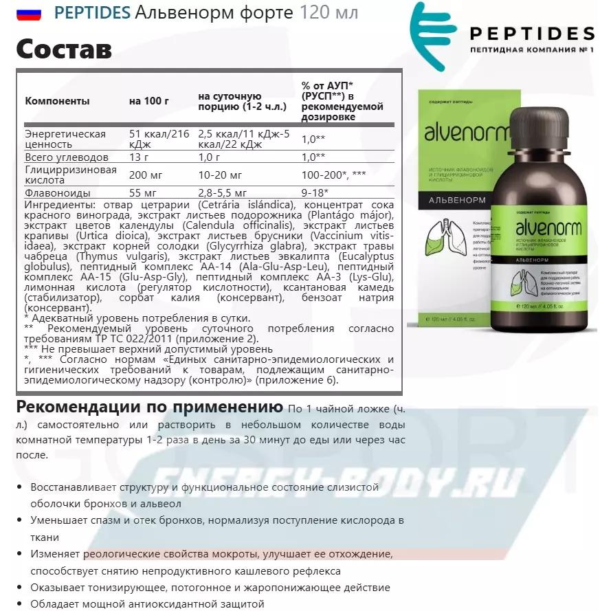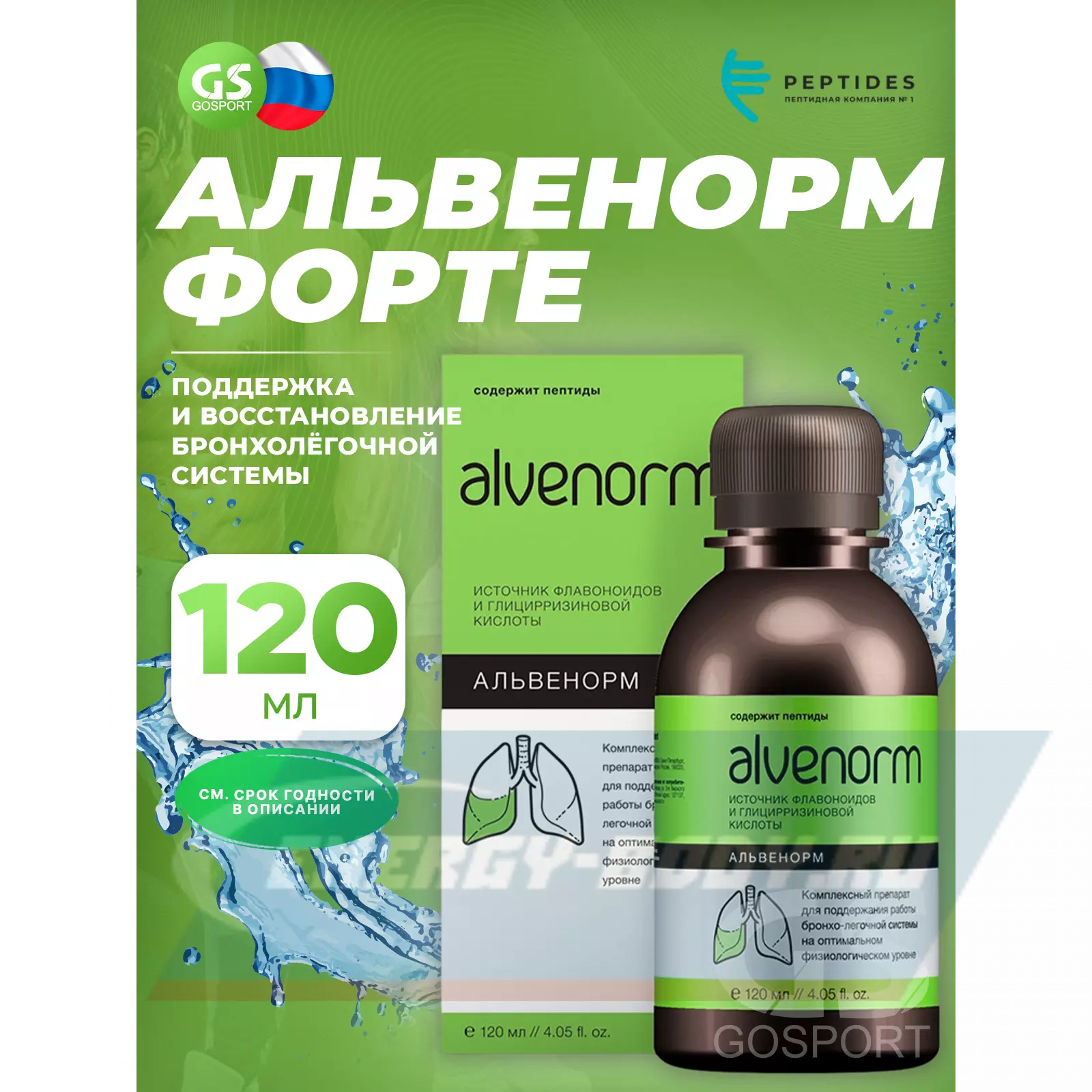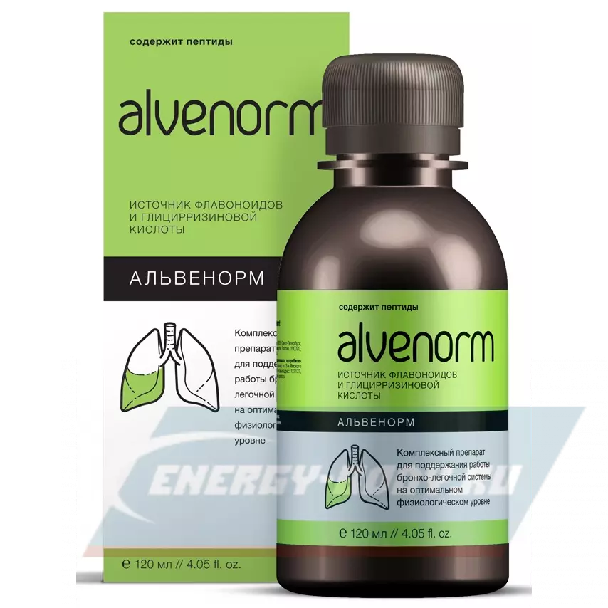 Альвенорм форте — инновационный многокомпонентный препарат с пептидами, специально созданный с целью профилактики нарушений работы бронхолегочной системы. Сочетание интенсивно действующих ультракоротких пептидов и целого комплекса целебных фитоэкстрактов (исландского мха, подорожника, листа брусники, крапивы, корня солодки, эвкалипта, календулы, чабреца) обеспечивает наиболее эффективный результат при профилактике и коррекции заболеваний бронхолегочного дерева.