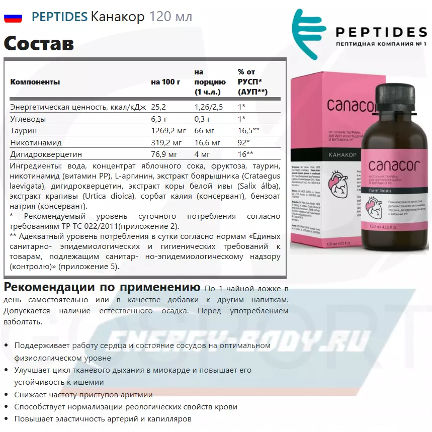 Рекомендован в качестве источника таурина, никотинамида и дигидрокверцетина.