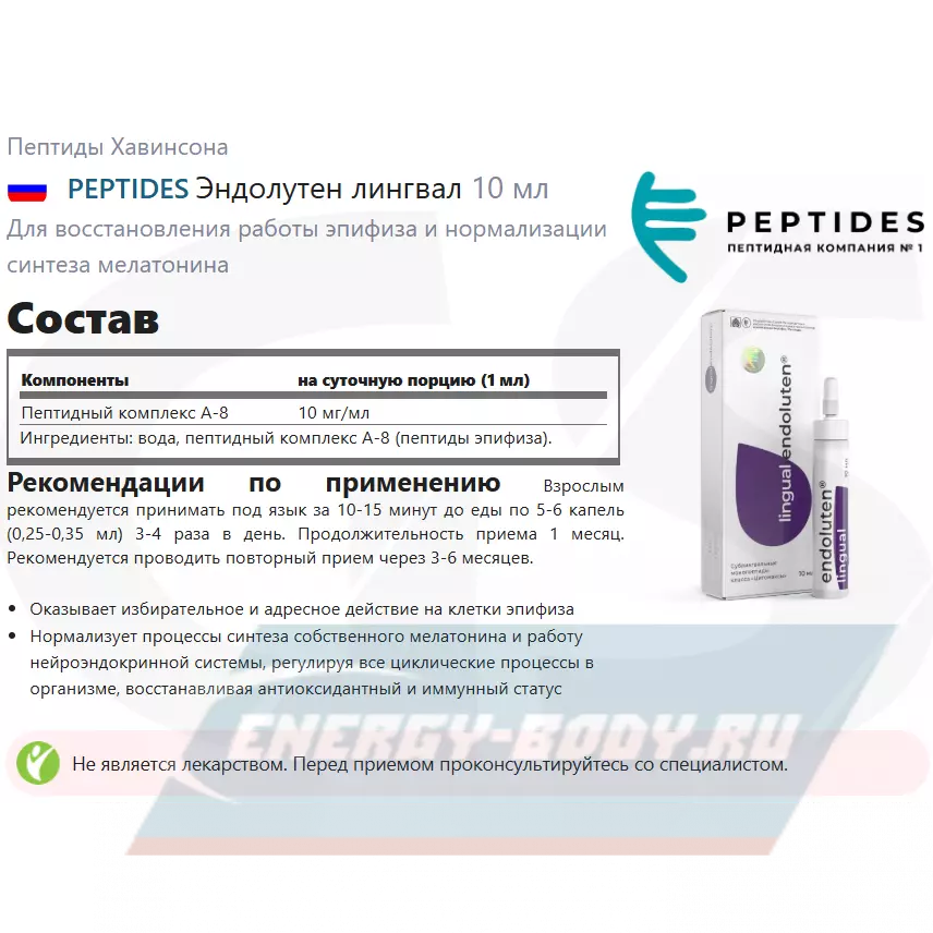 Ингредиенты: вода, пептидный комплекс А-8 (пептиды эпифиза).