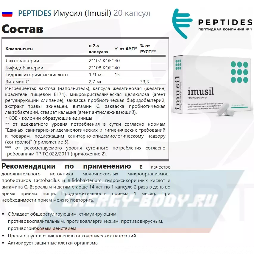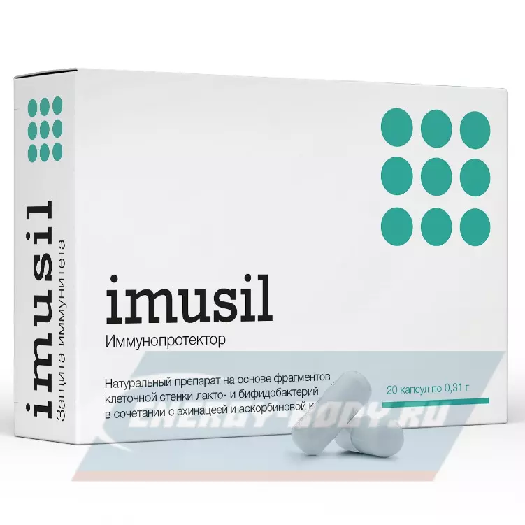 Натуральный инновационный иммунореставратор на основе фрагментов клеточной стенки лакто- и бифидобактерий в сочетании с эхинацеей и аскорбиновой кислотой. Активирует все звенья ослабленной повседневными нагрузками, инфекциями и стрессом иммунной защиты. Снижает риск возникновения злокачественных новообразований. Имусил абсолютно безвреден, хорошо переносится и взрослыми, и детьми и не имеет побочных эффектов.