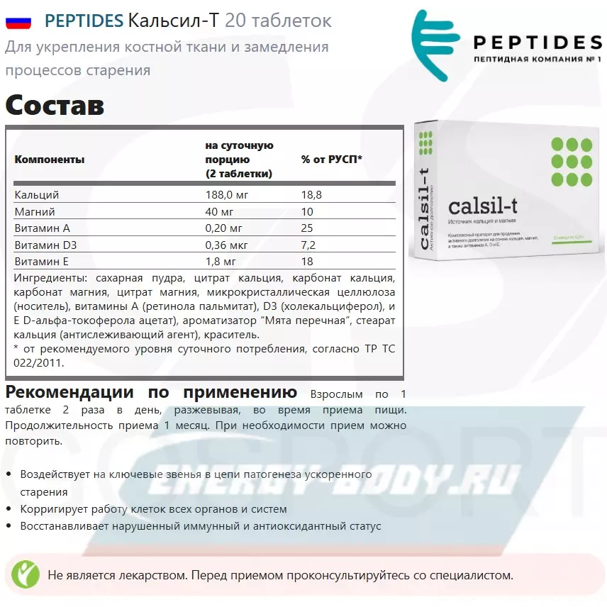 PEPTIDES Кальсил-Т 20 таблеток — Для укрепления костной ткани и замедления процессов старения