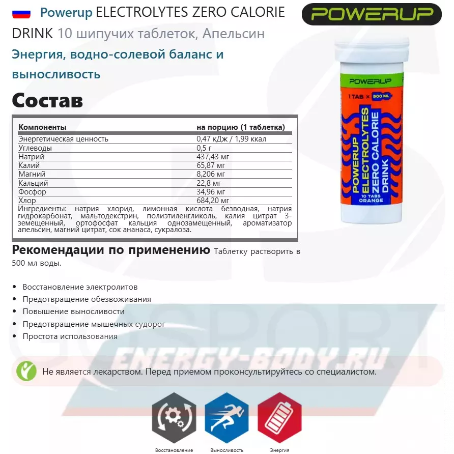 Powerup ELECTROLYTES ZERO CALORIE DRINK 10 шипучих таблеток, Апельсин — Энергия, водно-солевой баланс и выносливость