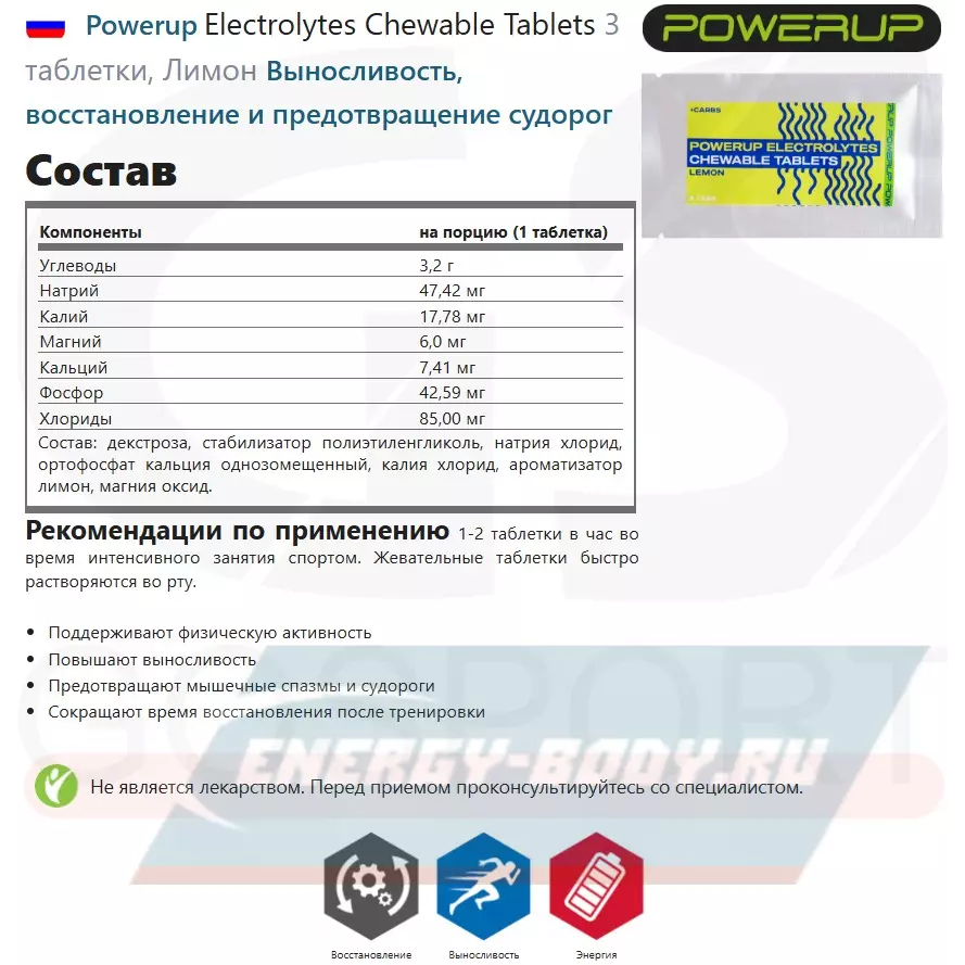 Состав: декстроза, стабилизатор полиэтиленгликоль, натрия хлорид, ортофосфат кальция однозомещенный, калия хлорид, ароматизатор лимон, магния оксид.