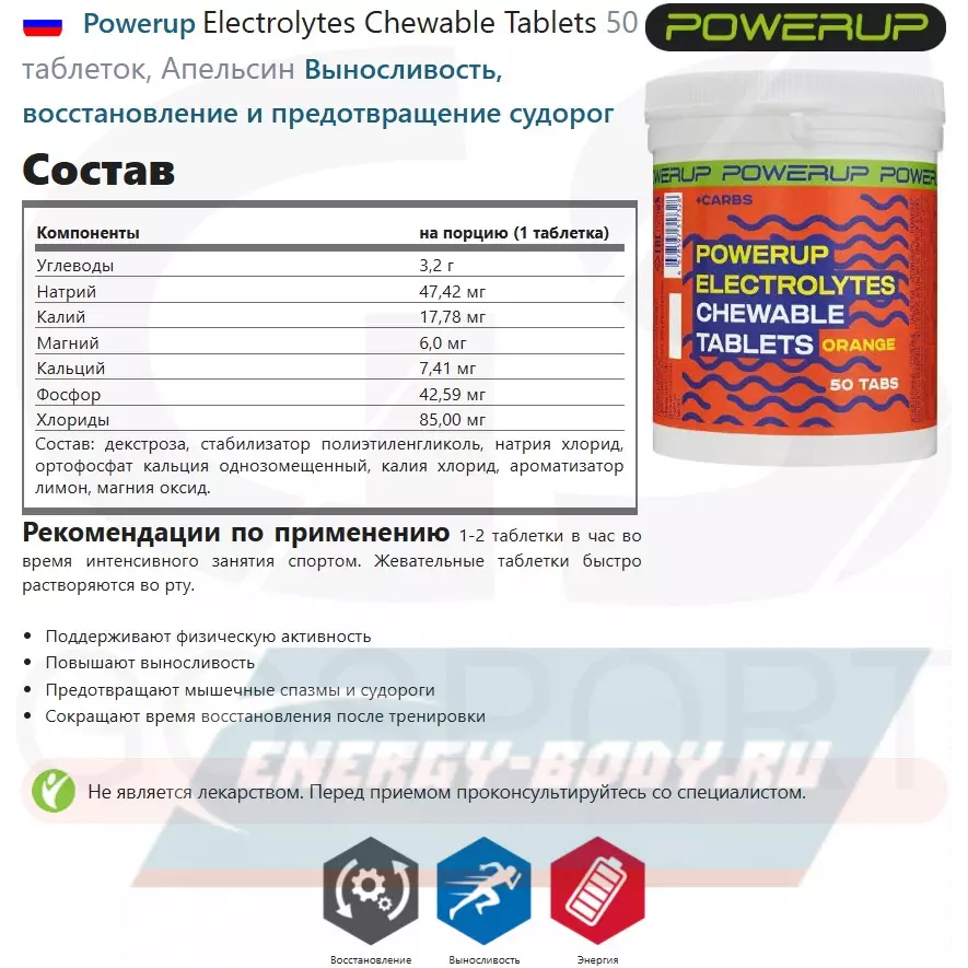 Powerup Electrolytes Chewable Tablets 50 таблеток, Апельсин — Выносливость, восстановление и предотвращение судорог