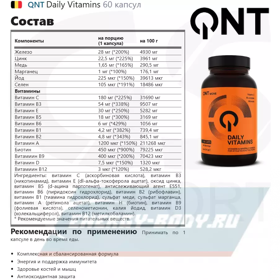 Взрослым принимать по 1 капсуле в день во время еды. Продолжительность приема 3 недели.Состав QNT Daily Vitamins