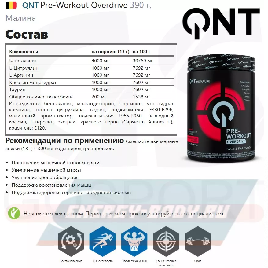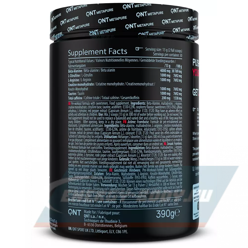 Ингредиенты: бета-аланин, мальтодекстрин, L-аргинин, моногидрат креатина, основа цитруллина, таурин, подкислители: E330-E296, малиновый ароматизатор, подсластители: E955-E950, безводный кофеин, L-тирозин, экстракт красного перца (Capsicum Annum L.), краситель: E120.