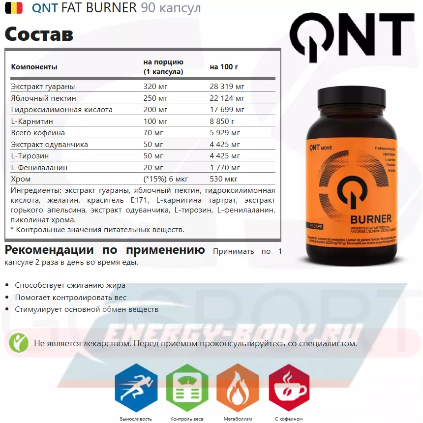 Также жиросжигатель Burner от QNT содержит: яблочный пектин, понижающий чувство голода, особый вид апельсина, увеличивающий сжигание жиров и пиколинат хрома, регулирующий уровень сахара в крови и снижающий аппетит. Жиросжигатель помогает повысить эффективность тренинга и придти к желаемой форме.