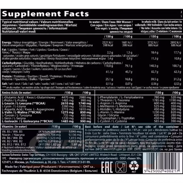 Действительно, в дополнение к богатой концентрации сывороточного белка, эта формула очень высокого качества содержит натуральные аминокислоты BCAA, а также отличный витаминный и углеводный комплекс