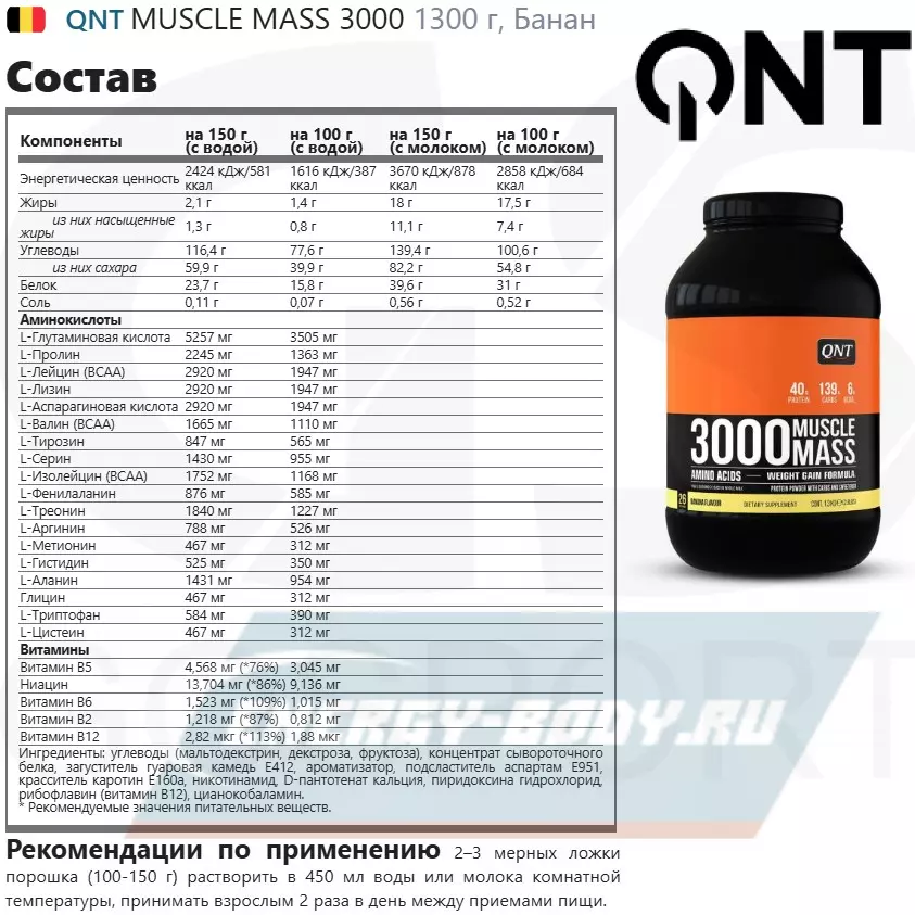 Ингредиенты: углеводы (мальтодекстрин, декстроза, фруктоза), концентрат сывороточного белка, загуститель гуаровая камедь E412, ароматизатор, подсластитель аспартам E951, красситель каротин Е160а, никотинамид, D-пантотенат кальция, пиридоксина гидрохлорид, рибофлавин (витамин В12), цианокобаламин.