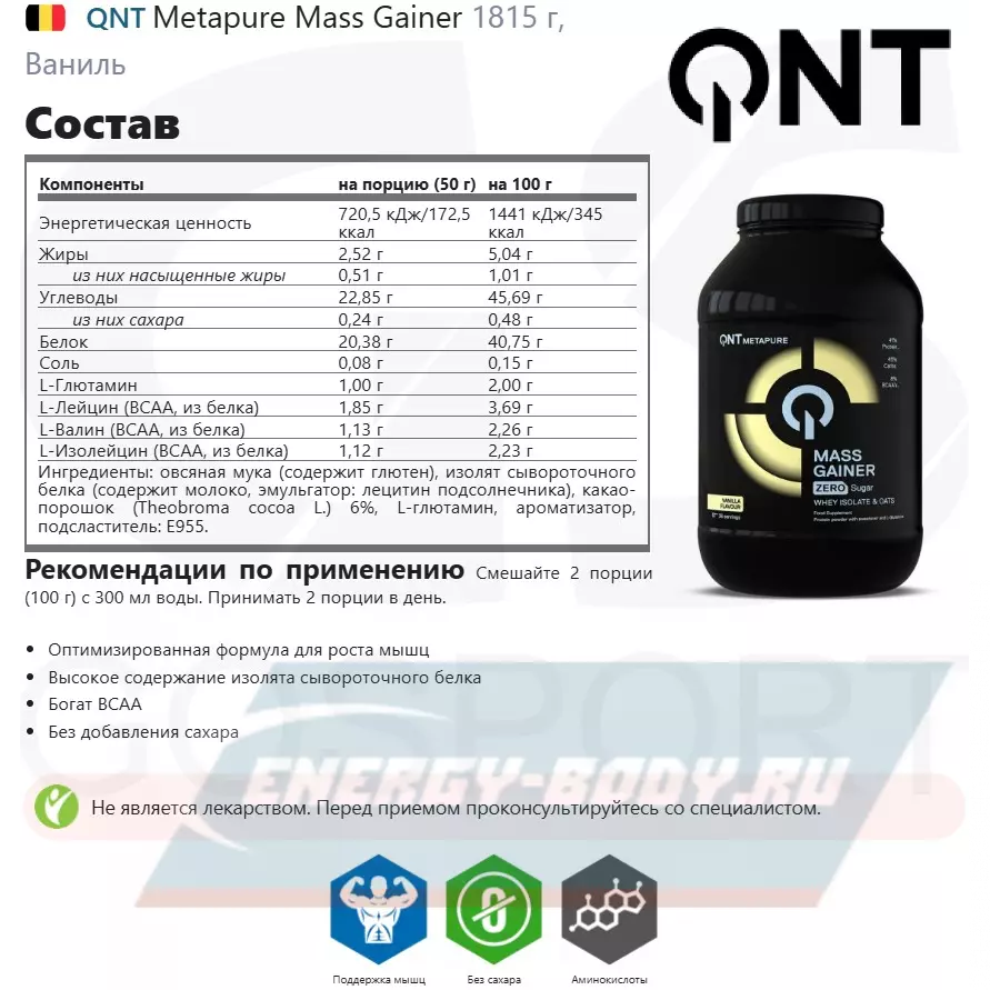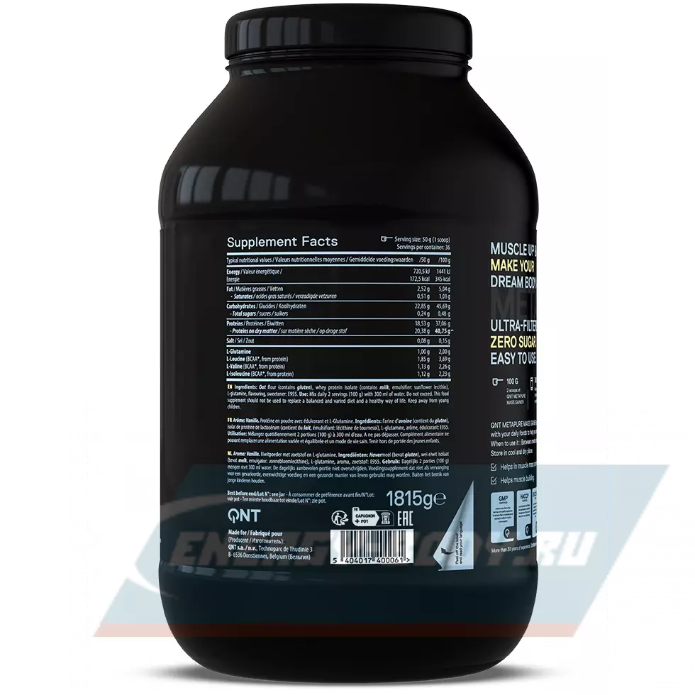 Metapure Mass содержит высококачественный изолят сывороточного белка, обеспечивающий рост мышц в идеальных условиях. Изолят сывороточного белка намного чище и более концентрирован в белке, чем обычная сыворотка. Этот белок, кроме того, очень быстро усваивается организмом. Незаменимые аминокислоты (BCAA) из природных источников (L-изолейцин, L-лейцин и L-валин) обеспечивают лучшее восстановление после усилий.