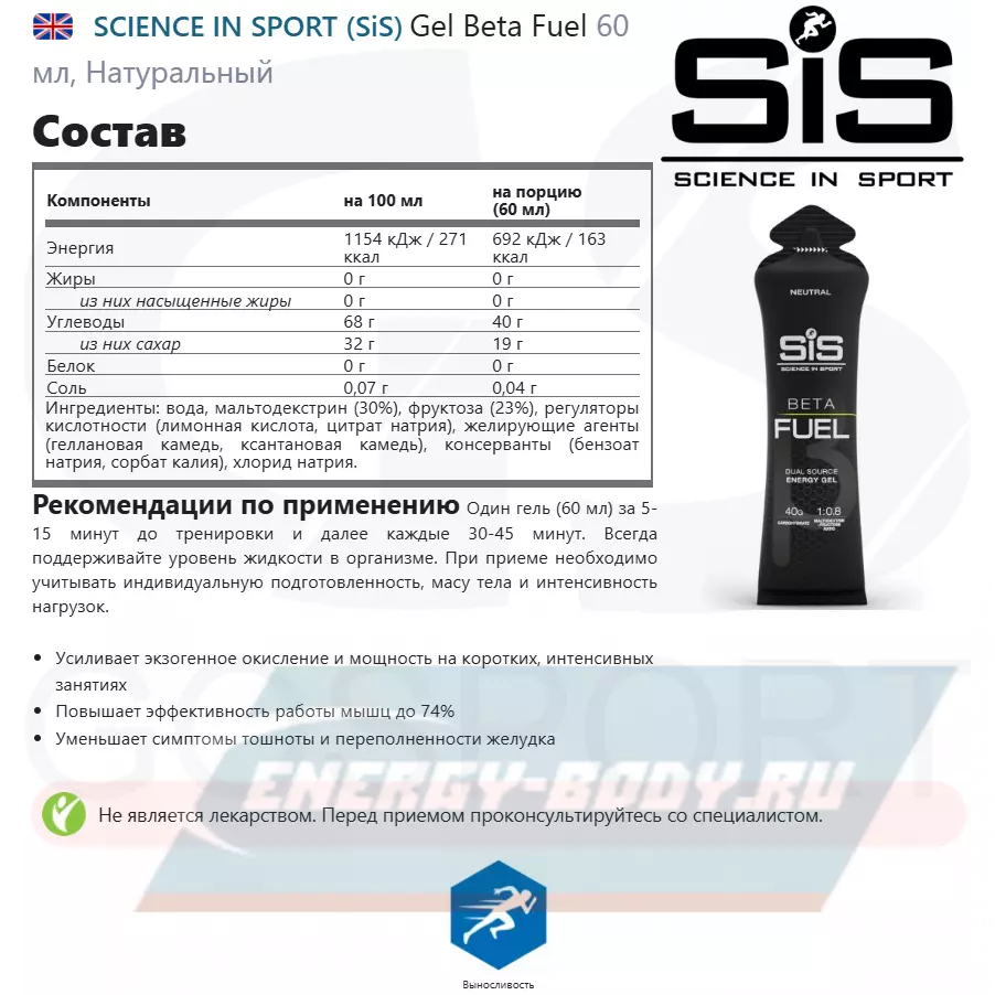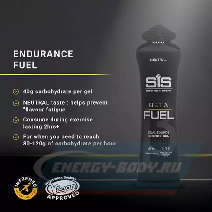 Спортивные диетологи рекомендуют принимать гель с фруктозой и мальтодекстрином, ведь он позволяет использовать организму на 17% углеводов больше чем в формуле 2:1, а следовательно - получать больше энергии. Используйте гели SiS и с другими продуктами линейки Beta Fuel.