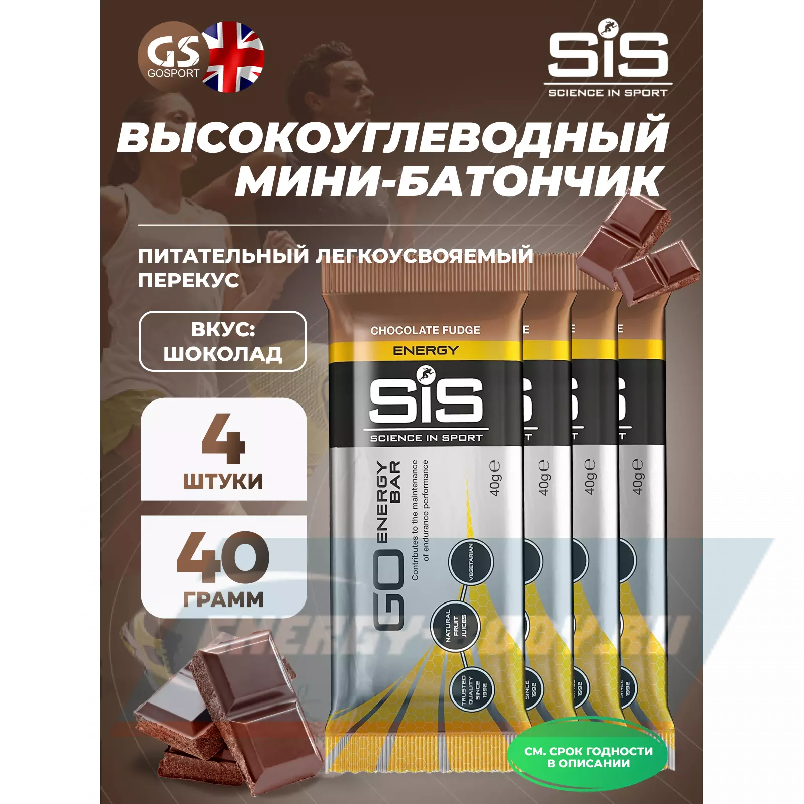 SCIENCE IN SPORT (SiS) GO Energy Bar 4 x 40 г, Шоколад — Питательный легкоусвояемый перекус