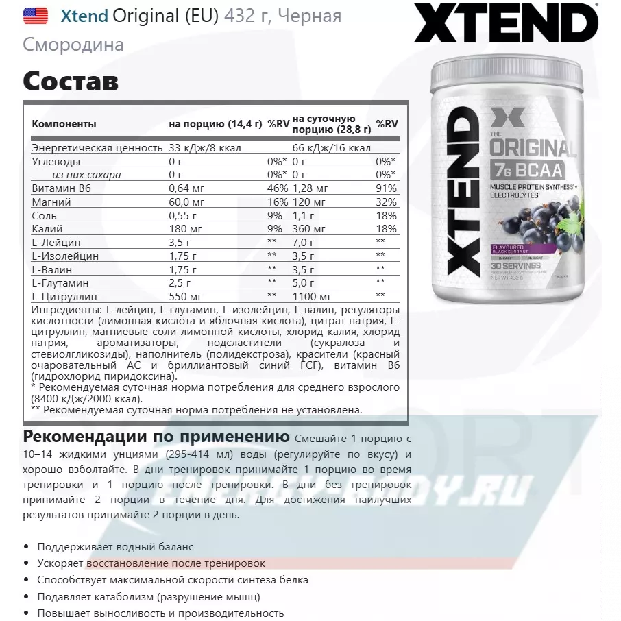 Комплекс Xtend SCIVATION является одним из лучших восстановительных комплексов ВСАА. Данный продукт это комплекс ВСАА аминокислот, которые обладают ярко выраженными анаболическими способностями. В состав входят такие эффективные составляющие как ВСАА, Глютамин, пиридоксин, цитруллин.