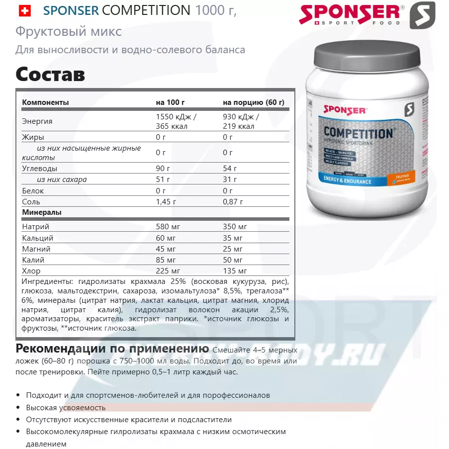 2) В ассортименте Sponser имеется также изотонический напиток Isotonic, который при той же рекомендованной максимальной концентрации (80 г на 1 литр воды) отличается от напитка Competition следующим: