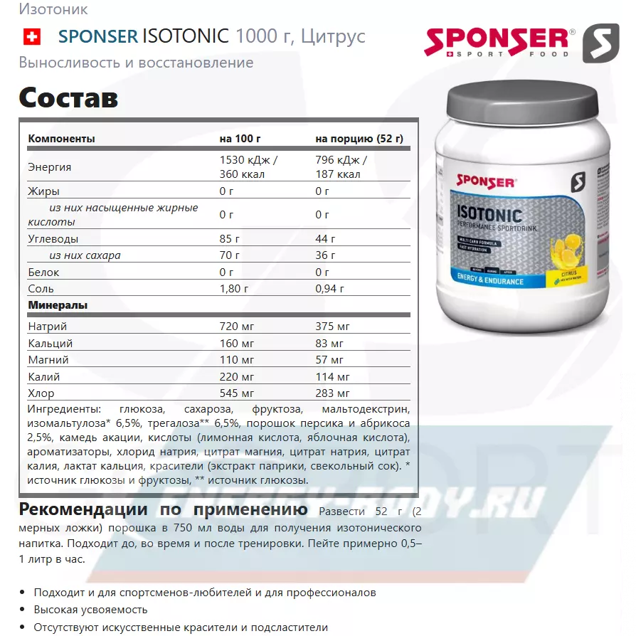 Профессиональный изотонический напиток - утолитель жажды, компенсирующий потери микроэлементов при гипернагрузках, содержит важные электролитические минералы и витамины. Комбинация различных типов Сахаров повышает энергетическое значение на 20-50% по сравнению со спортивными напитками, содержащими только один тип сахара (например, Jentjens, Med Sci Sport Exerc 2004). С Изотоником от Sponser организм усваивает жидкость, минералы и витамины гораздо быстрее. Применяется до, во время и после спортивных занятий. Легко усваивается и имеет очень приятный фруктовый вкус.