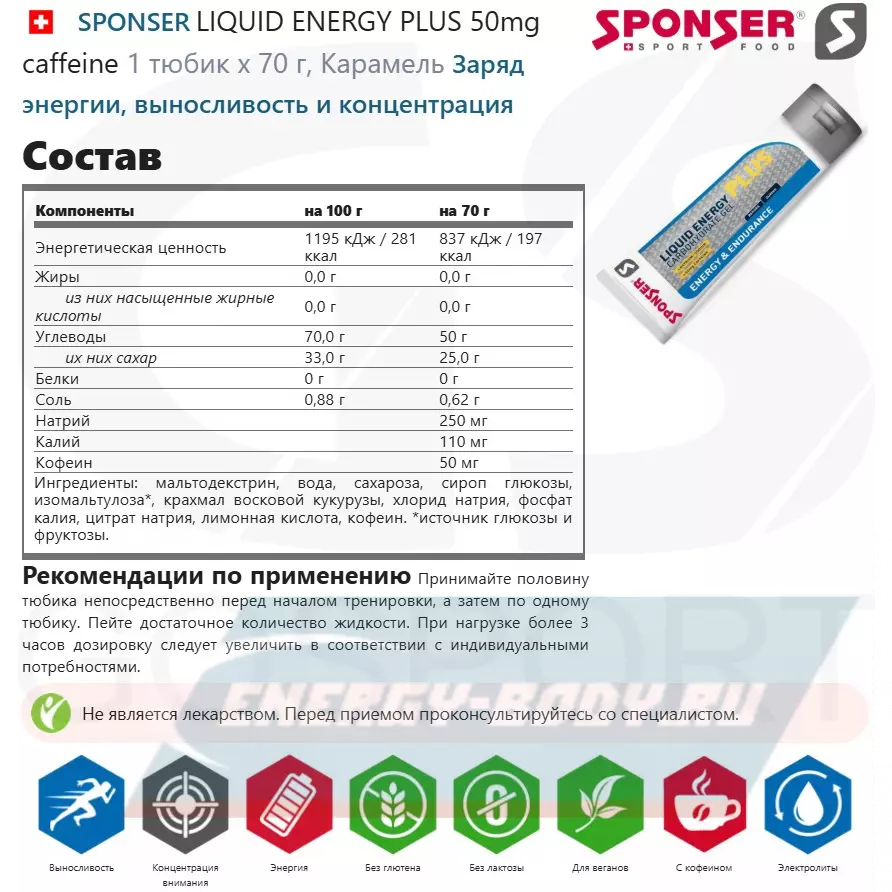SPONSER LIQUID ENERGY PLUS 50mg caffeine 3 тюбика x 70 г, Карамель — Заряд энергии, выносливость и концентрация