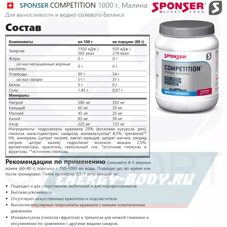 2) В ассортименте Sponser имеется также изотонический напиток Isotonic, который при той же рекомендованной максимальной концентрации (80 г на 1 литр воды) отличается от напитка Competition следующим: