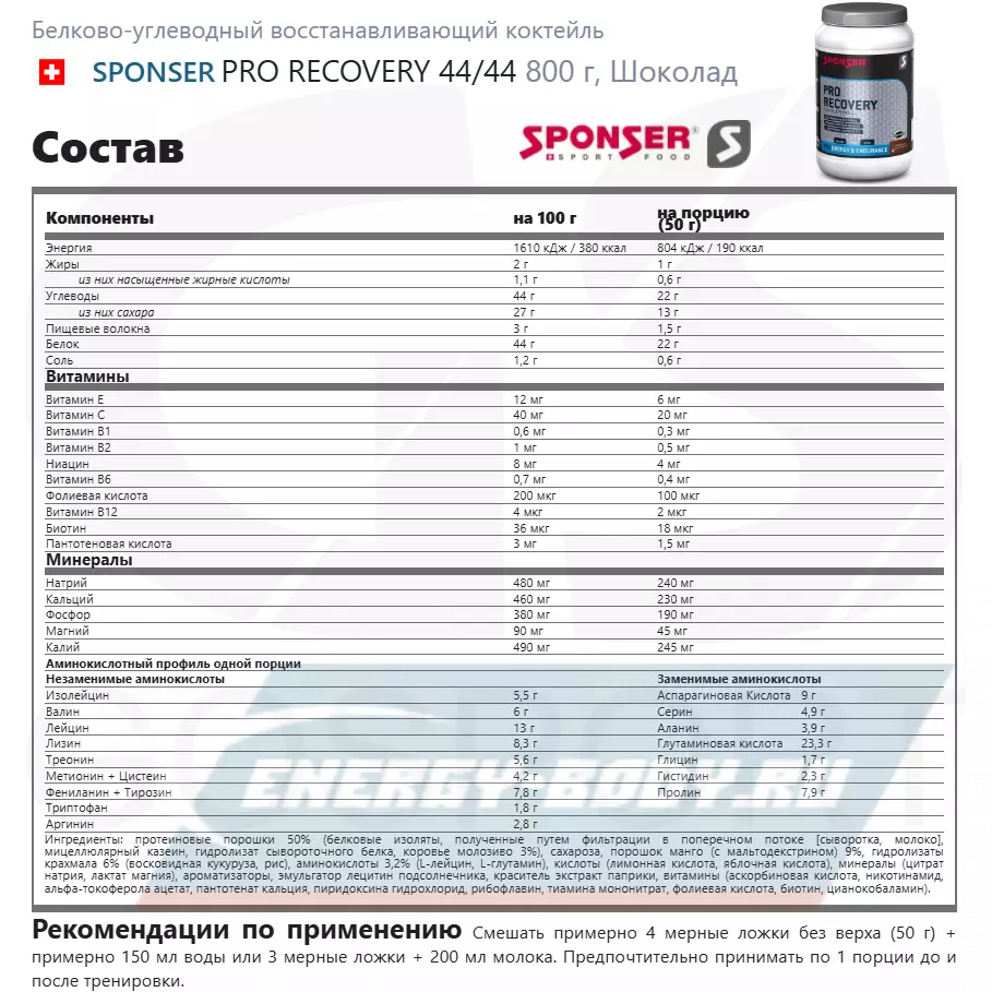 Рекомендации по применению Смешать примерно 4 мерные ложки без верха (50 г) + примерно 150 мл воды или 3 мерные ложки + 200 мл молока. Предпочтительно принимать по 1 порции до и после тренировки.