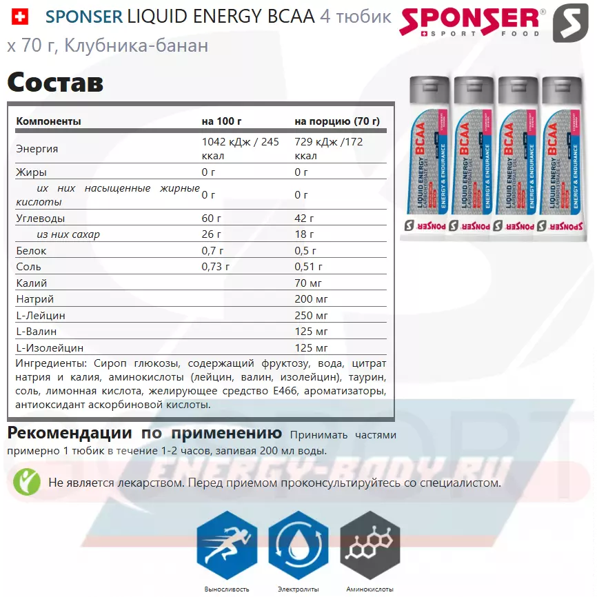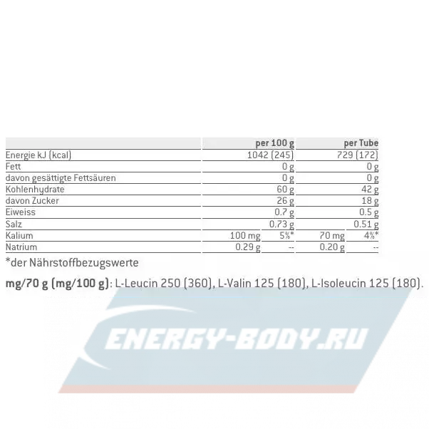 - (70 г) содержит: 172 ккал; белки 0,5 г; соль 0,51 г; углеводы 42 г (в т.ч. сахарá 18 г); жиры 0 г; натрий 0,20 мг; калий 70 мг (4% РНП), лейцин 250 мг, изолейцин 125 мг, валин 125 мг (всего ВСАА 500 мг).