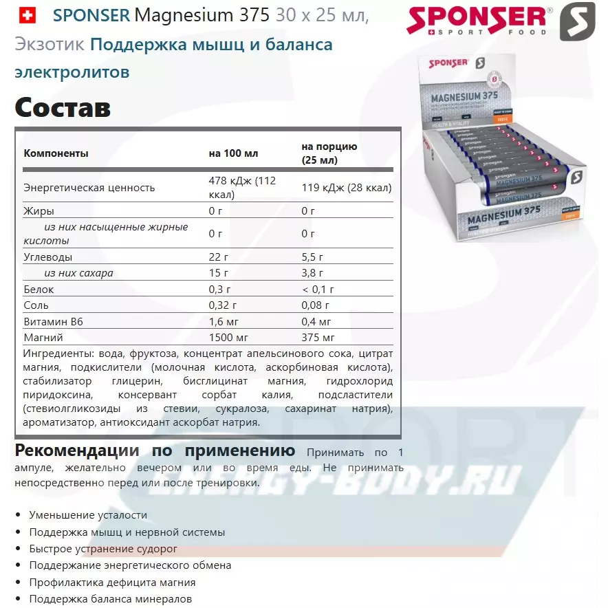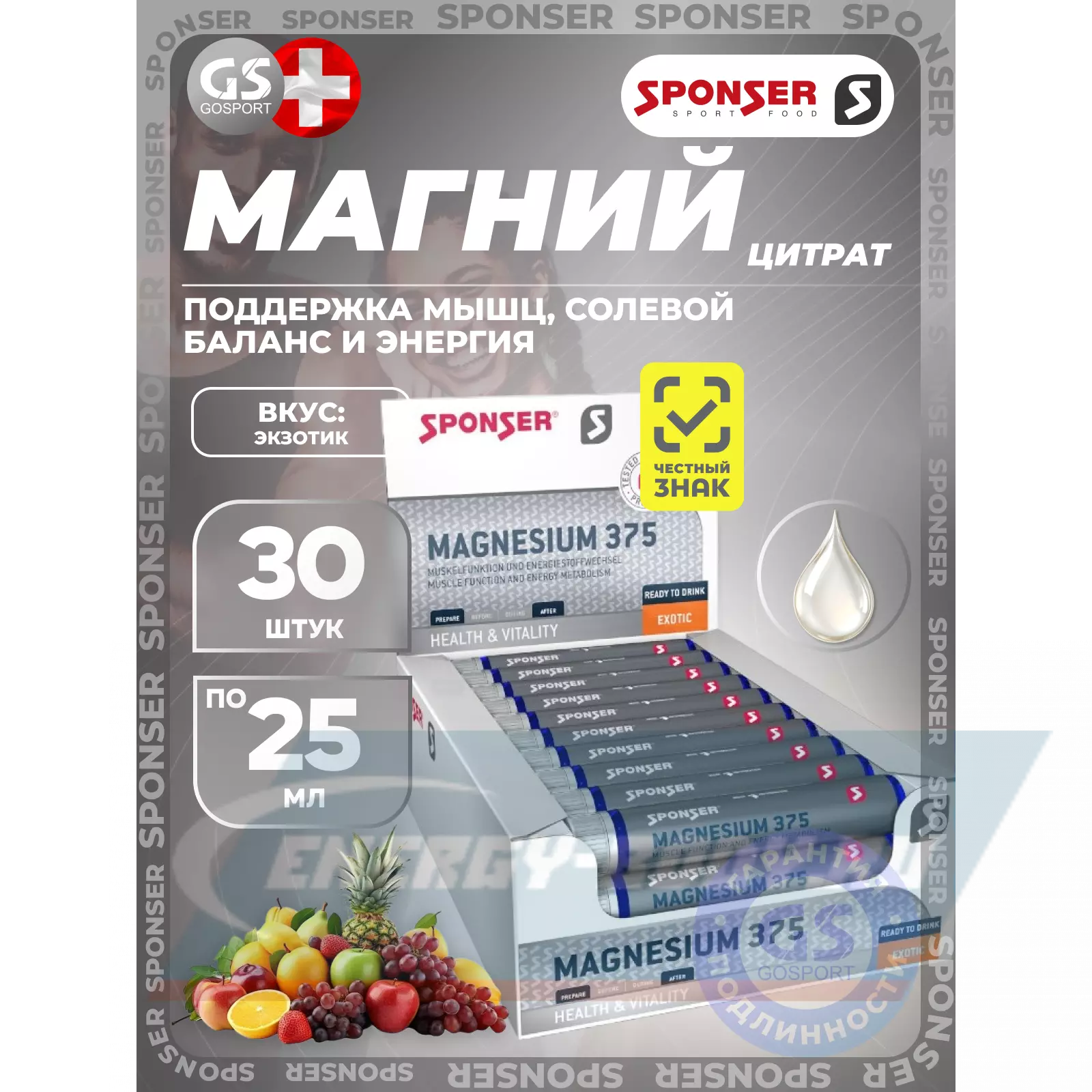 SPONSER Magnesium 375 экзотик - ампулы с высоким содержанием магния 375мг и витаминами, со вкусом экзотик. Эти три компонента способствуют уменьшению усталости и истощения, поддерживают функции мышц, баланс электролитов и энергетический метаболизм.