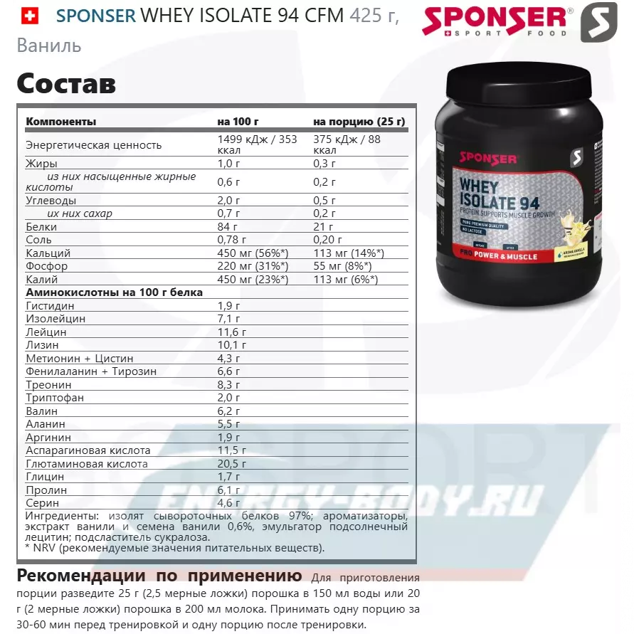 Состав SPONSER WHEY ISOLATE 94 CFM