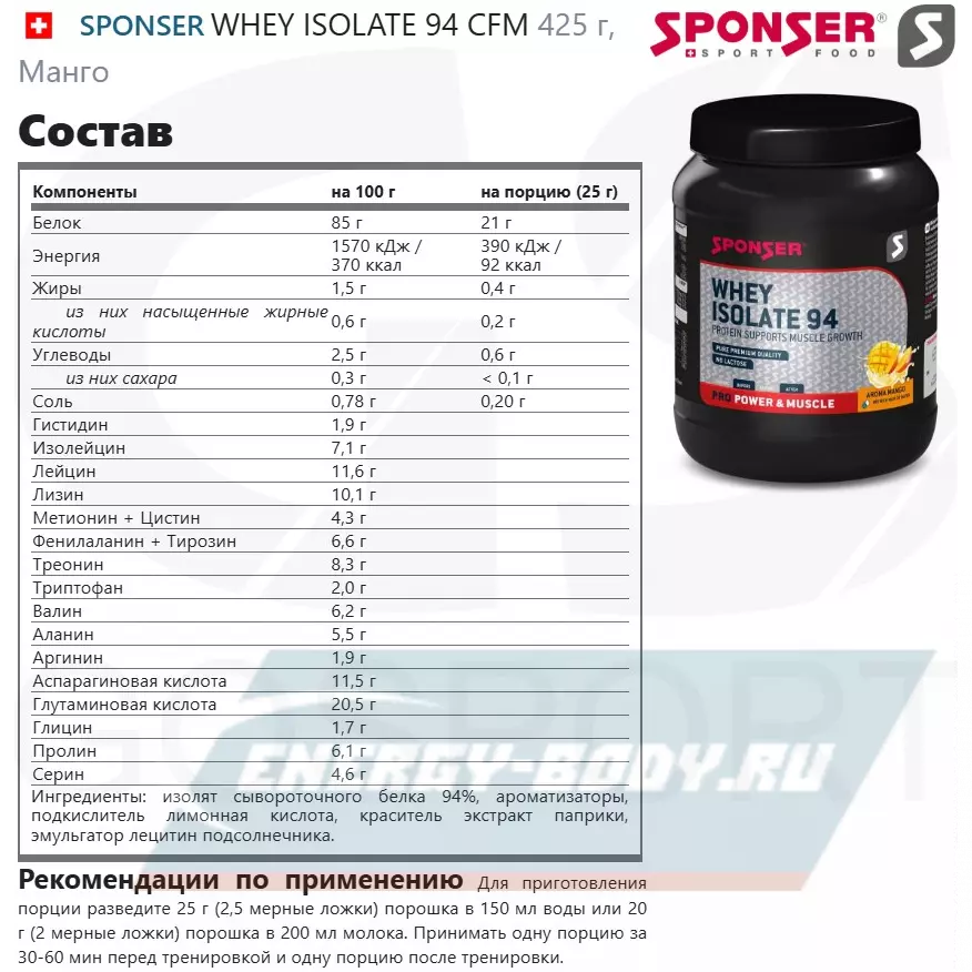 Состав SPONSER WHEY ISOLATE 94 CFM