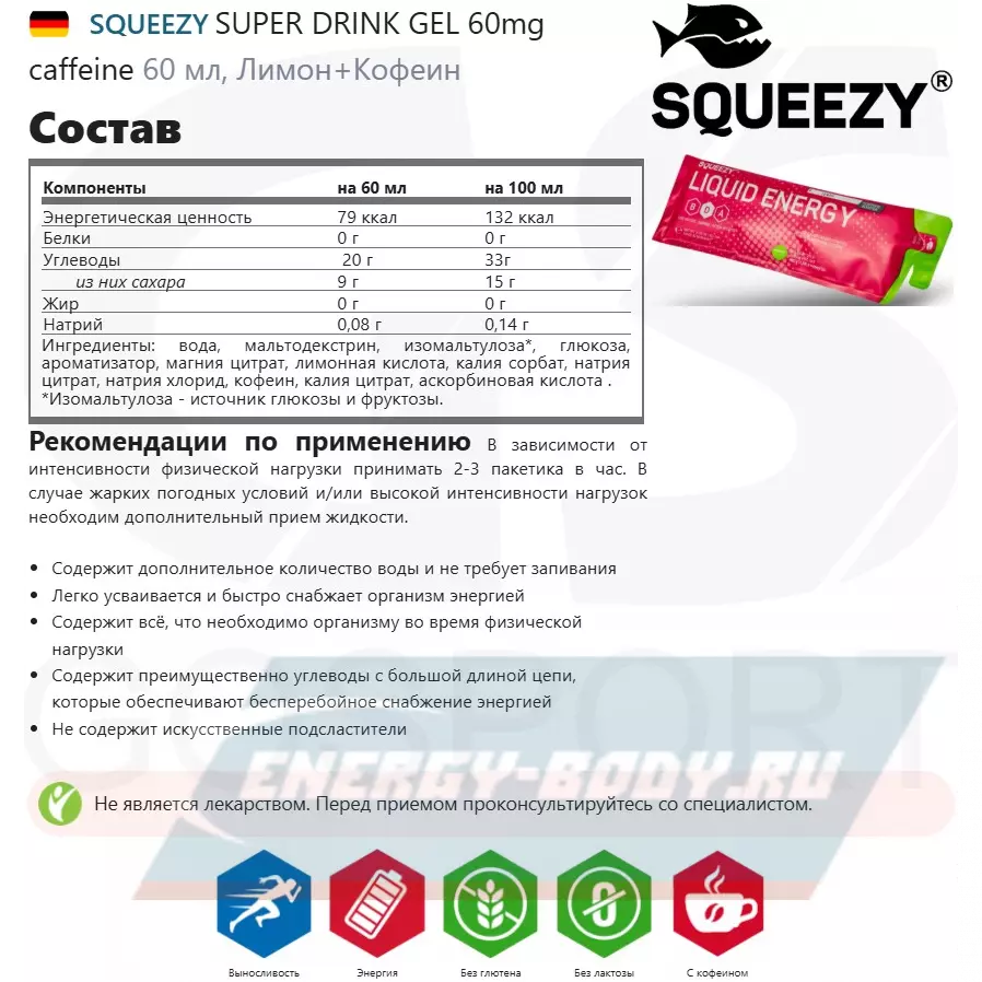 Состав SQUEEZY SUPER DRINK GEL 60mg caffeine