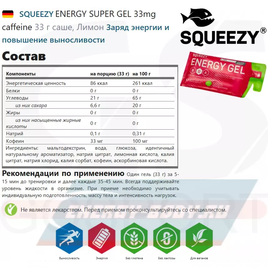 Состав SQUEEZY ENERGY SUPER GEL 33mg caffeine