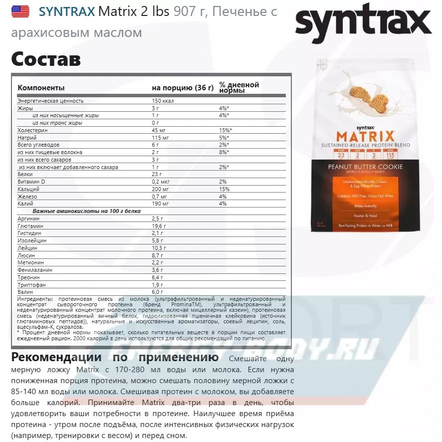 Смешайте одну мерную ложку Matrix с 240 мл. воды или молока. Для тех, кто нуждается в пониженной порции протеина, половина одной мерной ложки смешайте с 120 мл. воды или молока. Когда вы мешаете с молоком вы добаляете больше калорий. Принимайте Matrix два-три раза в день, чтобы удовлетворить ваши потребности в протеине. Помните, что наилучшее время приема протеина - это с утра после подъема, после интенсивных физических нагрузок, таких как тренировки с весом и прямо перед сном. Мы гарантируем, что Matrix размешивается даже ложкой и имеет превосходный вкус. Не превышайте рекомендуемую дозировку. Продукт не должен использоваться, как замена полноценного питания. Прекратите прием продукта, если почувствуете отклонения от нормального состояния здоровья.