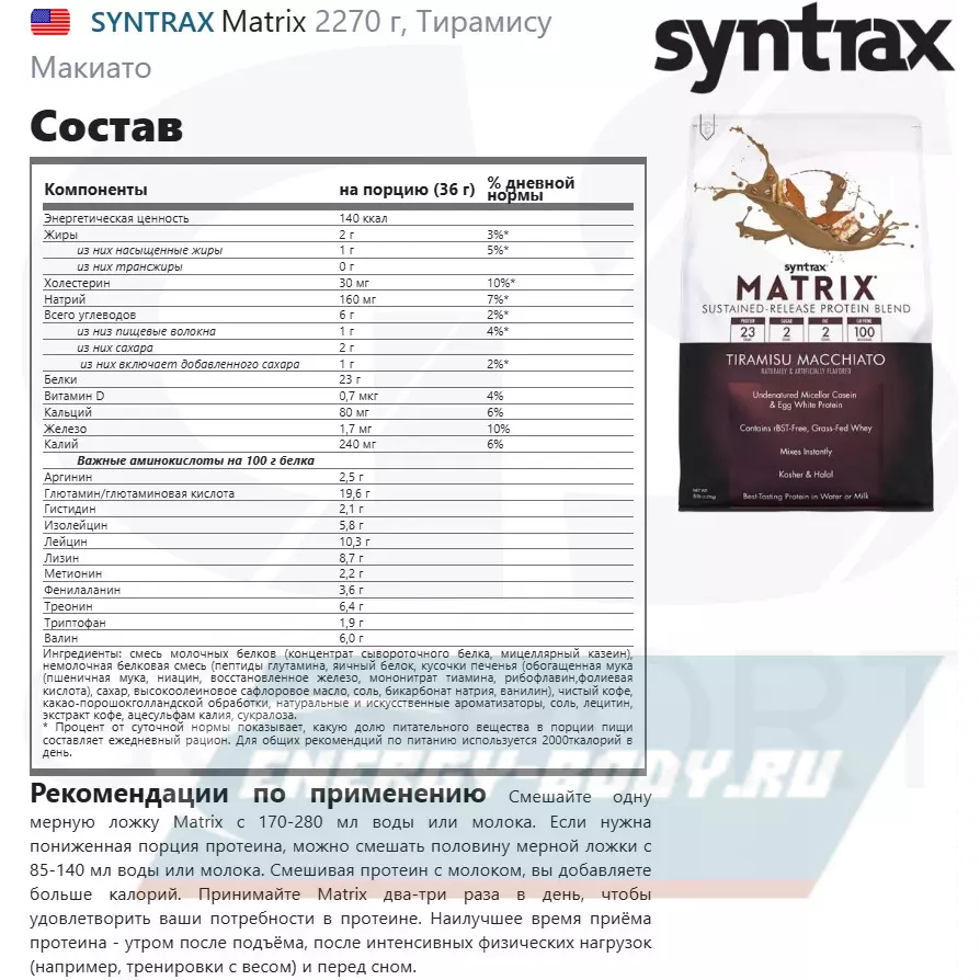 Смешайте одну мерную ложку Matrix с 240 мл. воды или молока. Для тех, кто нуждается в пониженной порции протеина, половина одной мерной ложки смешайте с 120 мл. воды или молока. Когда вы мешаете с молоком вы добаляете больше калорий. Принимайте Matrix два-три раза в день, чтобы удовлетворить ваши потребности в протеине. Помните, что наилучшее время приема протеина - это с утра после подъема, после интенсивных физических нагрузок, таких как тренировки с весом и прямо перед сном. Мы гарантируем, что Matrix размешивается даже ложкой и имеет превосходный вкус. Не превышайте рекомендуемую дозировку. Продукт не должен использоваться, как замена полноценного питания. Прекратите прием продукта, если почувствуете отклонения от нормального состояния здоровья.