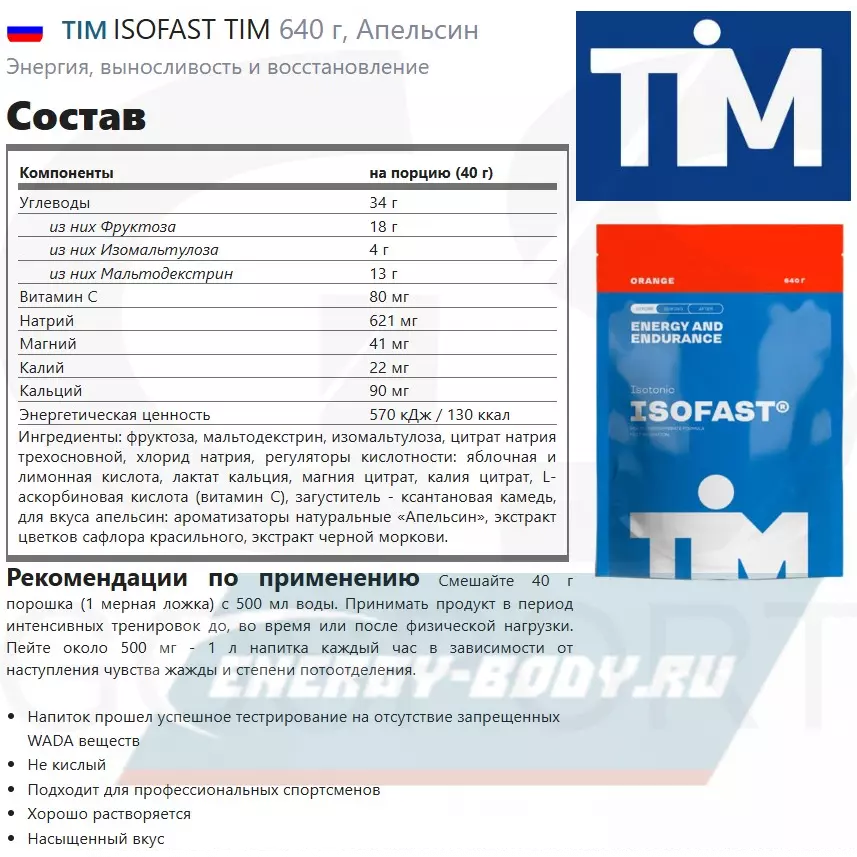 Ингредиенты: фруктоза, мальтодекстрин, изомальтулоза, цитрат натрия трехосновной, хлорид натрия, регуляторы кислотности: яблочная и лимонная кислота, лактат кальция, магния цитрат, калия цитрат, L-аскорбиновая кислота (витамин С), загуститель - ксантановая камедь, для вкуса апельсин: ароматизаторы натуральные «Апельсин», экстракт цветков сафлора красильного, экстракт черной моркови.